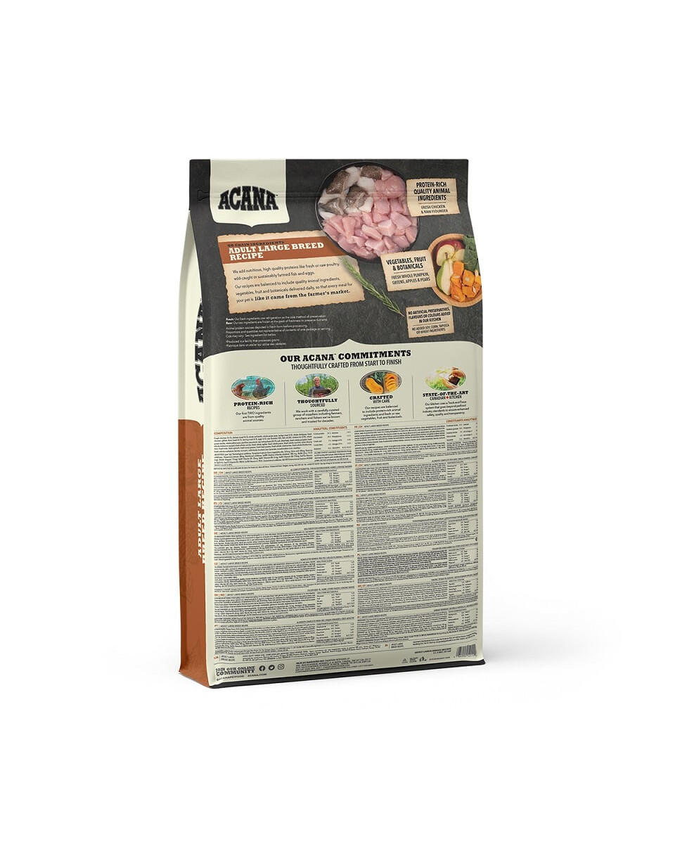 Metabolická energia Acana Adult Large Breed 3458 kcal / kg (415 kcal na 250 ml šálku). 33% energie pochádza z bielkovín, 32% z ovocia a zeleniny, 35% z tukov.
