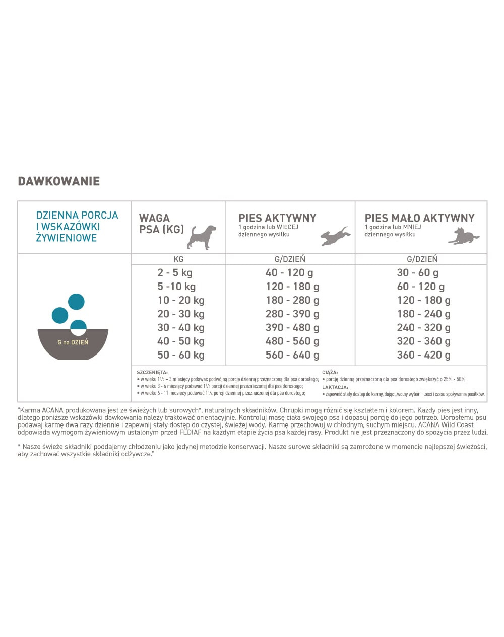 Vysokokvalitné suroviny použité v receptúre zabezpečujú vysokú stráviteľnosť krmiva a dobrú absorpciu živín. Rybie krmivo sa vyznačuje nízkou alergénnosťou a vysokým obsahom nenasýtených mastných kyselín Omega 3. Omega kyseliny sú nevyhnutné pre správnu funkciu obehového a nervového systému a podporujú silný zrak, kožu a srsť psa. Acana Wild coast poskytuje vysokokvalitné bielkoviny živočíšneho pôvodu, ktoré sú pre psy najlepšie vstrebateľné. Pridanie ovocia, zeleniny a byliniek do krmiva zlepšuje jeho chutnosť a chuť. Jablká, hrušky a tekvica poskytujú prírodné vitamíny a antioxidanty na podporu imunitného systému.