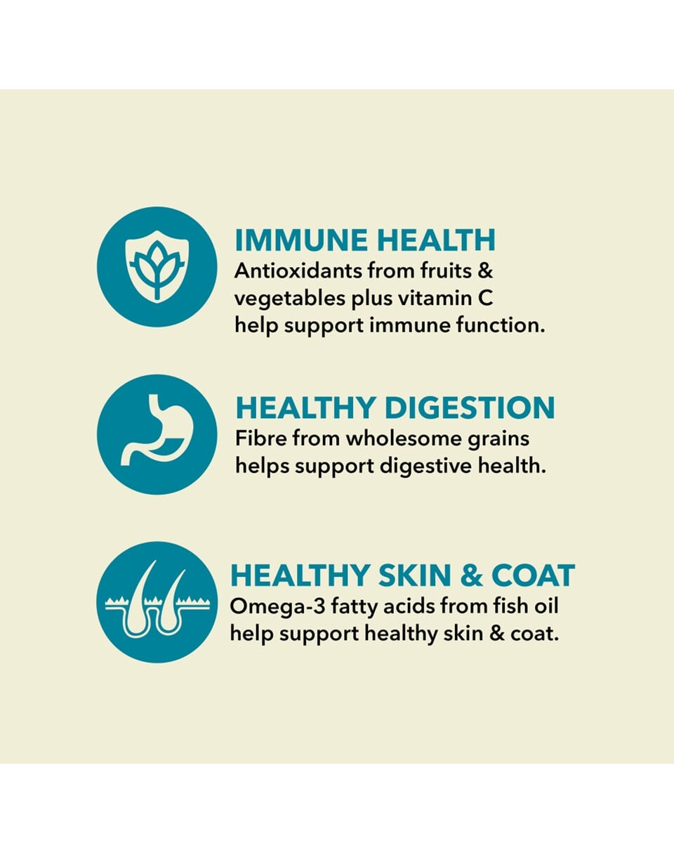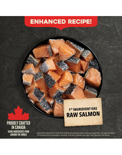 Surový losos (22 %), sušený sleď (19 %), perlový jačmeň, celý hrach, ovos bez šupiek, bravčová masť (8 %), celý ovos, vláknina z cícera, rybí olej (1 %), uhličitan vápenatý, chlorid draselný, sušené riasy, soľ, sušený koreň čakanky, čerstvá celá tekvica, čerstvá celá tekvica pižmová, čerstvá celá mrkva, čerstvé celé jablká, čerstvé celé hrušky, čerstvé celé cukety, čerstvá kapusta, čerstvý špenát, čerstvé listy repy, čerstvé listy červenej repy, celé brusnice, celé čučoriedky, celé saskatoons, kurkuma, bodliak, koreň lopúcha, levanduľa, koreň valeriány, šípky