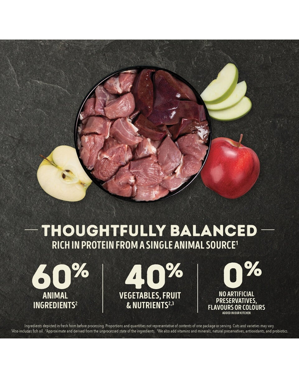 Zloženie: surové jahňacie mäso (21 %), dehydrované jahňacie mäso (19 %), celý zelený hrášok, celá červená šošovka, surová jahňacia pečeň (8 %), repkový olej, čerstvé jablká (4 %), celé cícer, celá zelená šošovka , celý žltý hrášok , vláknina šošovka, hrachový škrob, slnečnicový olej, riasy (zdroj EPA a DHA), surové jahňacie držky (1 %), surové jahňacie obličky (1 %), čerstvá celá maslová tekvica, čerstvá celá soľ, sušená koreň čakanky, celé čučoriedky, celé čučoriedky, kurkuma, pestrec, koreň lopúcha, levanduľa, koreň proskurníku, šípky.