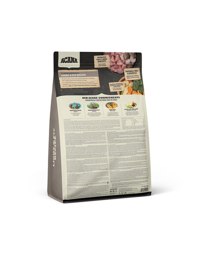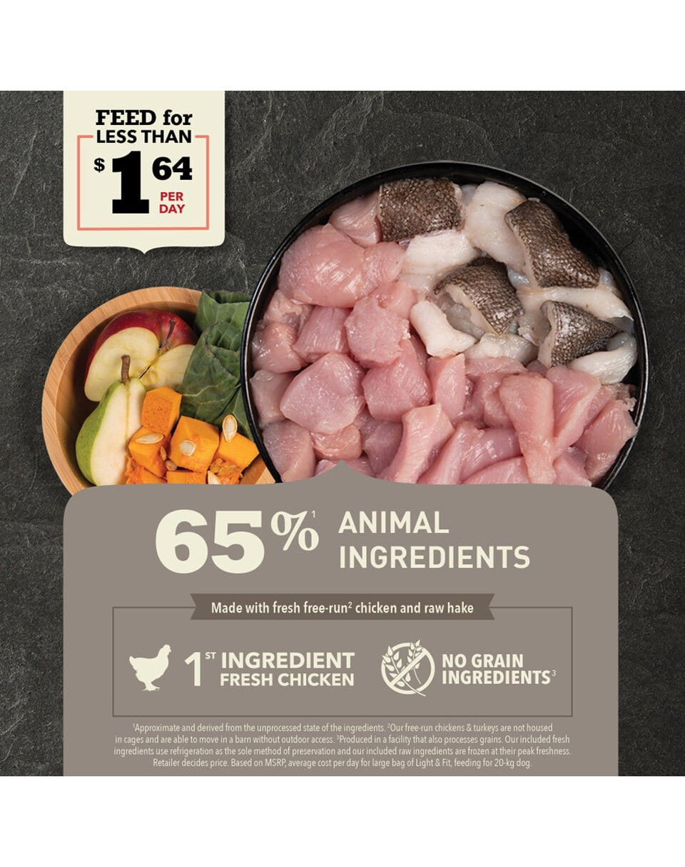 Zloženie: Čerstvé kuracie mäso (16%), dehydrované kuracie mäso (14%), dehydrované morčacie mäso (14%), červená šošovica, celý zelený hrášok, hrachová vláknina, čerstvé kuracie orgány (pečeň, srdce, obličky) (5%), dehydrované sleďové mäso (5%), čerstvé celé vajcia (4%), čerstvé mäso z platýsov (4%), lucerna (4%), fazuľa obyčajná (4%), zelená šošovica, celý žltý hrášok, kurací tuk (1%), sleďový olej (1%), čerstvá kuracie chrupavka (1%), hnedá sušená chalúhka, čerstvá celá tekvica, čerstvá celá maslová tekvica, čerstvý celý paštrnák, čerstvý kel, čerstvý špenát, čerstvá tlačená kapusta, čerstvé listy repy, celá čerstvá mrkva, čerstvé červené lahodné jablká, čerstvé hrušky bartlett, mrazom sušená kuracia pečeň, mrazom sušená morčacie pečeň, čerstvé celé brusnice, čerstvé celé čučoriedky, koreň čakanky, kurkuma, bodliak mliečny, koreň lopúcha, kvet levandule, koreň marshmallow, šípky.