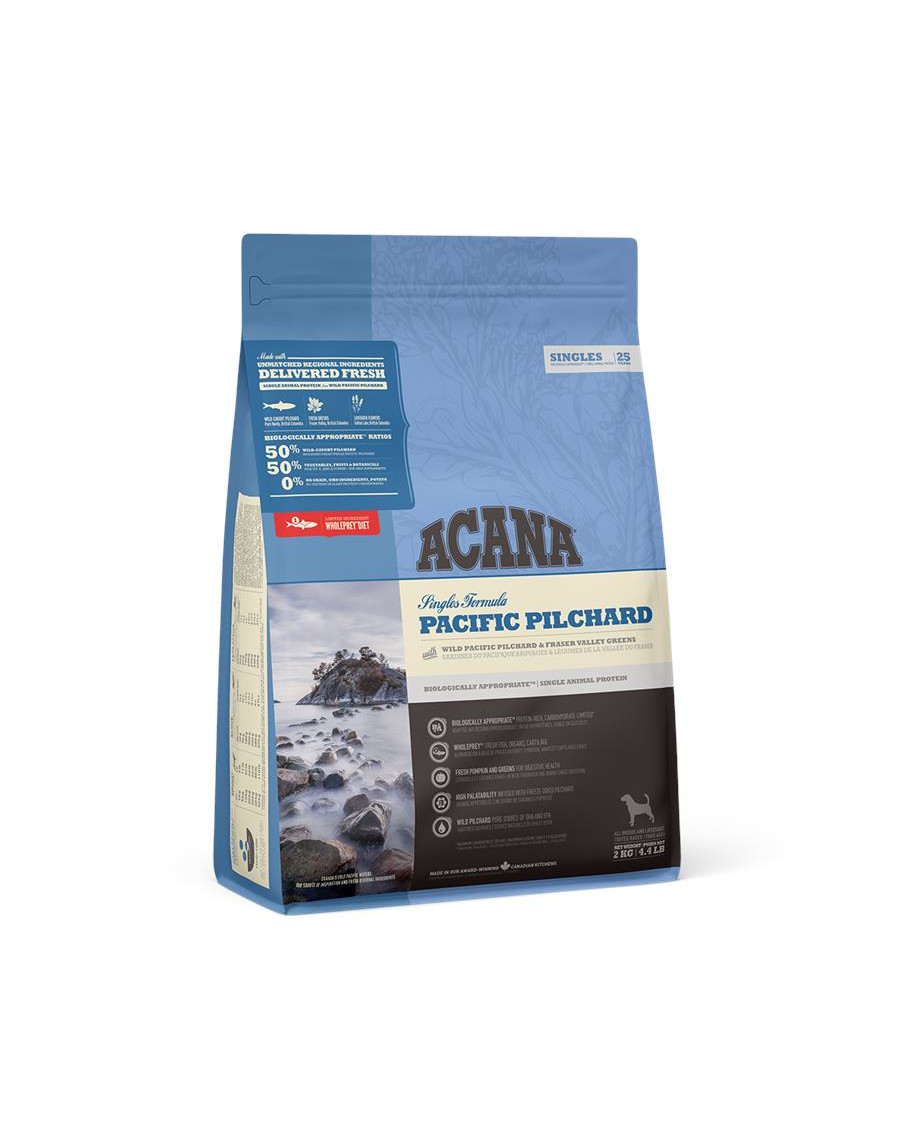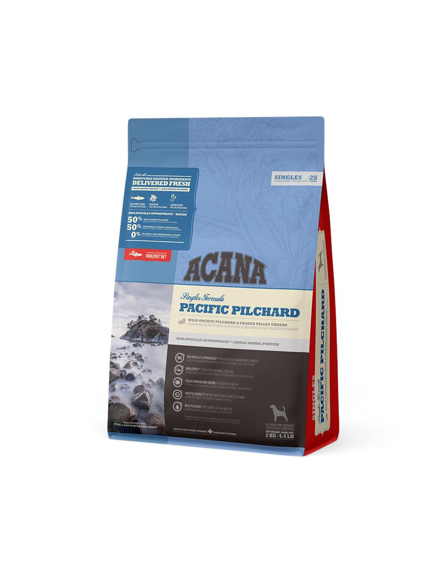 Acana PACIFIC PILCHARD to jedzenie monobiałkowe, zawierające 50% sardynek w odżywczych proporcjach Whole Prey. Ryby poławiane są w naturalnym środowisku i dostarczane świeże i całe. Dodatek liofilizowanej wątróbki zwiększa smakowitość, a świeża dynia jest źródłem włókien ułatwiających trawienie.