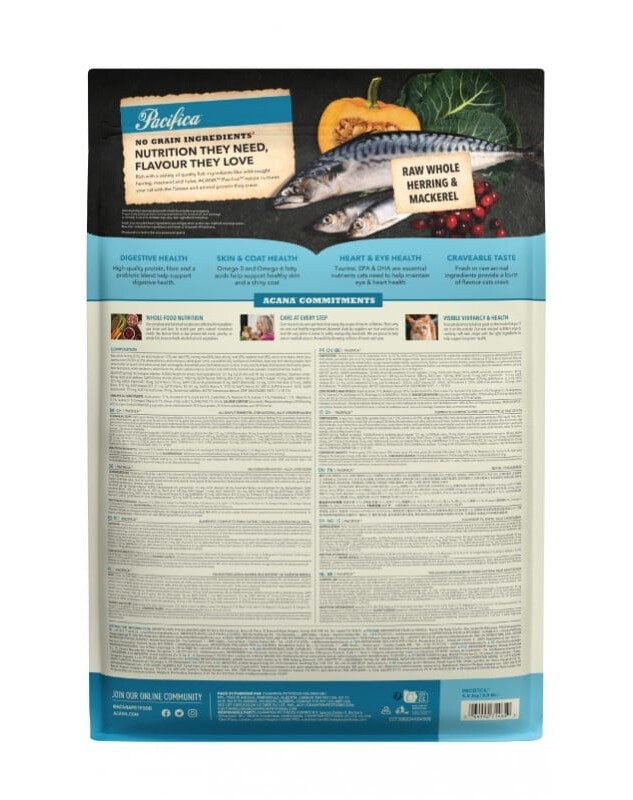 ACANA PACIFICA obsahuje ulovené ryby: sleď, makrela, merlúza, treska belasá, platýz a sebastes v pomere Celá korisť, aby odrážali prirodzenú stravu. Ingrediencie sa dodávajú čerstvé alebo surové z ostrova North Vancouver Island.
