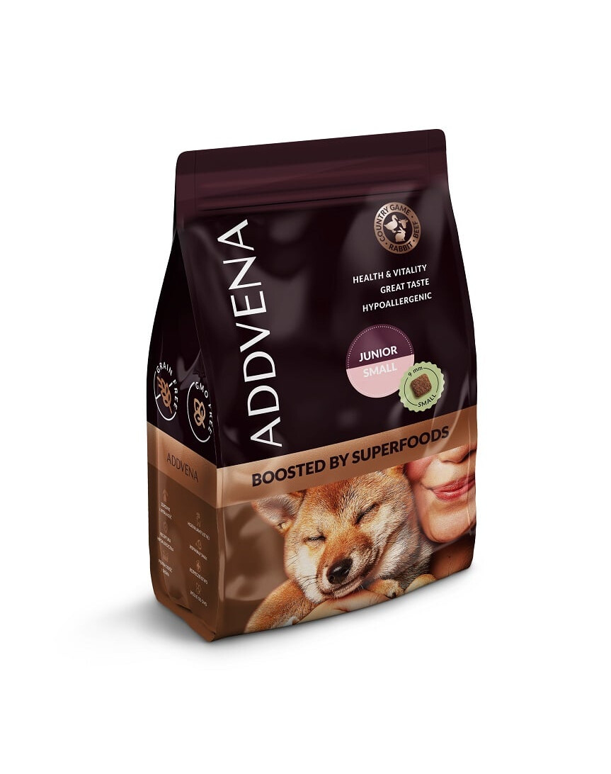ADDVENA BOOSTED BY SUPERFOODS Junior Small je kompletné krmivo bez obilnín pre šteňatá malých plemien (do 12 mesiacov veku) a dojčiace suky.