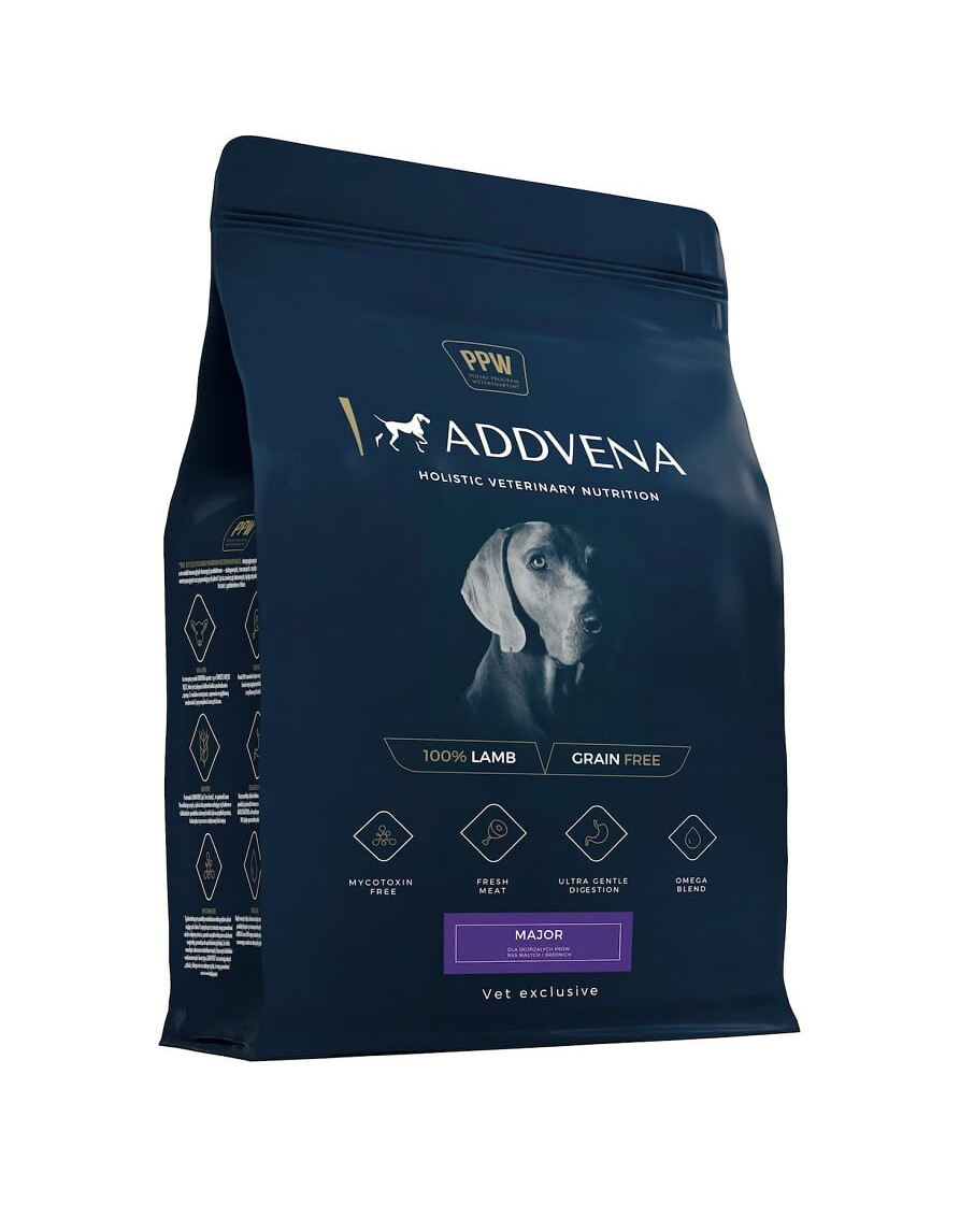 ADDVENA MAJOR je veľmi chutné, plnohodnotné krmivo bez obilnín na báze čerstvého jahňacieho mäsa určené pre staršie psy, ktoré vyžadujú starostlivo zostavenú stravu kvôli ich o niečo menej aktívnemu životnému štýlu. Krmivo ADDVENA MAJOR odporúčame podávať po dovŕšení 7 rokov veku psa.