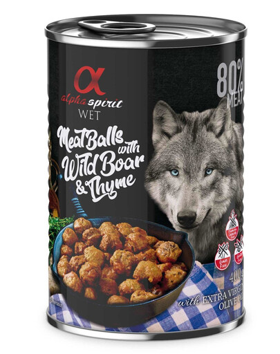 Zloženie: Mäso 80 % (kuracie mäso 70 %, mäso z diviaka 10 %), zemiakový škrob, hrachová bielkovina, tymián, minerálne látky, extra panenský olivový olej