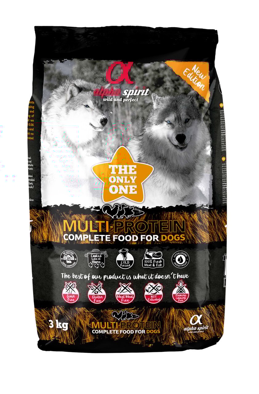 MULTIPROTEIN je receptúra pre dospelých psov. Kombinácia kuracieho, hovädzieho, bravčového mäsa a rýb je každodennéou pochúťkou. Mäso je doplnené zeleninou, ovocím a aromatickými bylinkami, ktorých úlohou je poskytovať vitamíny a minerály. Krmivo bolo pripravené procesom lisovania za studena a dokončené v chutné granule. Krmivo Alpha Spirit je bezobilné a neobsahuje obilniny.