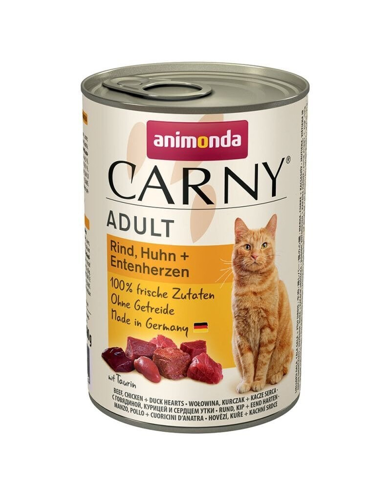 Animonda Carny Adult s hovädzím, kuracím a kačacím srdcom. Konzerva pre všetky dospelé mačky. Vyrobené z čerstvých surovín. Neobsahuje žiadne sójové ani umelé farbivá, konzervačné látky ani látky na zlepšenie chuti. Je to veľmi ľahko stráviteľná strava. Chráni imunitný systém a zvyšuje odolnosť organizmu.