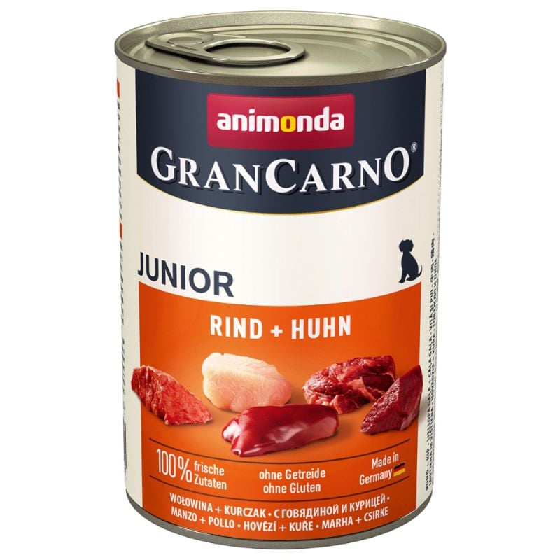 Kompletné krmivo so špeciálne prispôsobeným obsahom minerálov pre potreby mladých psov. Veľkosť kúskov je prispôsobená veku psov. Krmivo pre psov Animonda GranCarno Junior bolo vyrobené výhradne z čerstvého mäsa. Krmivo obsahuje špeciálnu kombináciu rôznych antioxidantov, ktoré chránia imunitný systém a obranyschopnosť. Animonda GranCarno je kvalitné krmivo prispôsobené potrebám rastúcich psov. Tento produkt obsahuje chutné druhy mäsa spracované do chutných kúskov. Zásadne neobsahuje farbivá a konzervačné látky.
