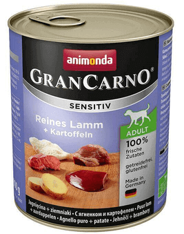 Animonda GranCarno Sensitive je vhodné aj pri diérach, pretože neobsahuje obilniny, sóju, konzervačné látky ani umelé farbivá.Zloženie: 53 % jahňa (držky, srdce, pečeň, pľúca), 10% zemiaky, chlorid sodný