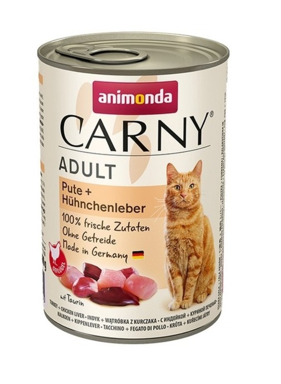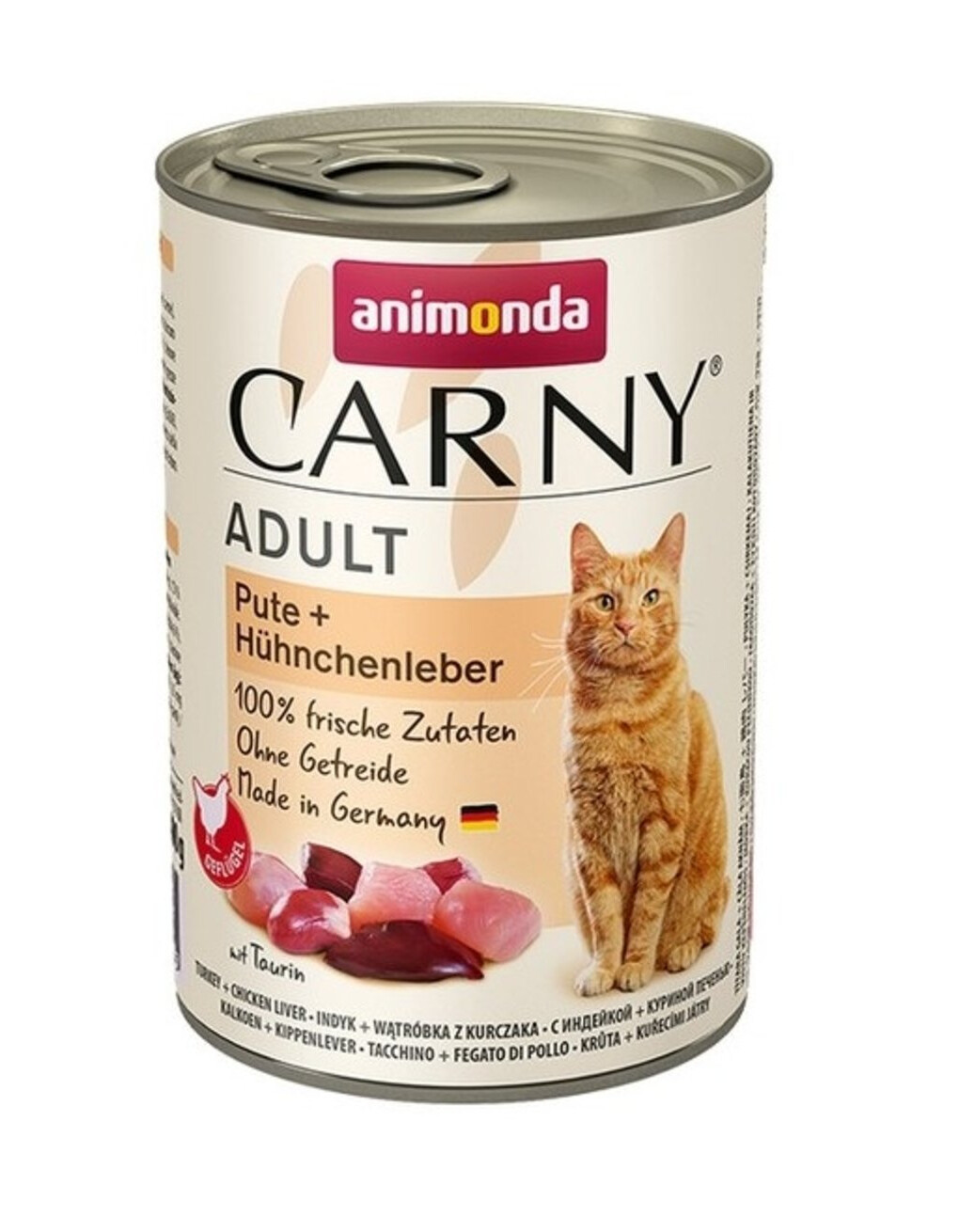 Prirodzené krmivo mačiek sa zakladá hlavne na mäse. Čo sa týka bylinných zložiek sú samostatne ako krmivo nevhodné, pretože mačky neprijímajú všetky dôležité živiny. Kukurica býva často príčinou potravinovej intolerancie a môže byť v mnohých prípadoch veľmi ťažko stráviteľná. Pri formulovaní receptúry Animonda Carny Adult sa kompletne upúšťa od obilnín ako aditív v krmive. Animonda Carny neobsahuje sóju, ktorá má vysoký alergénny potenciál. Čerstvé chudé mäso, vnútornosti (srdce, pľúca, pečeň) sú cenným zdrojom bielkovín. Vďaka vysoko kvalitným živočíšnym bielkovinám je organizmu dodávaný i prírodný taurín a aminokyseliny, ktoré sú nevyhnutné pre zdravý život mačky. Práve tieto látky neprodukuje organizmus v potrebnom množstve, preto musia byť získavané z krmiva. Taurín podporuje silný imunitný systém, zdravú funkciu srdca, zdravý zrak. Aminokyseliny prispievajú k zdravej koži, lesklej a hodvábnej srsti.