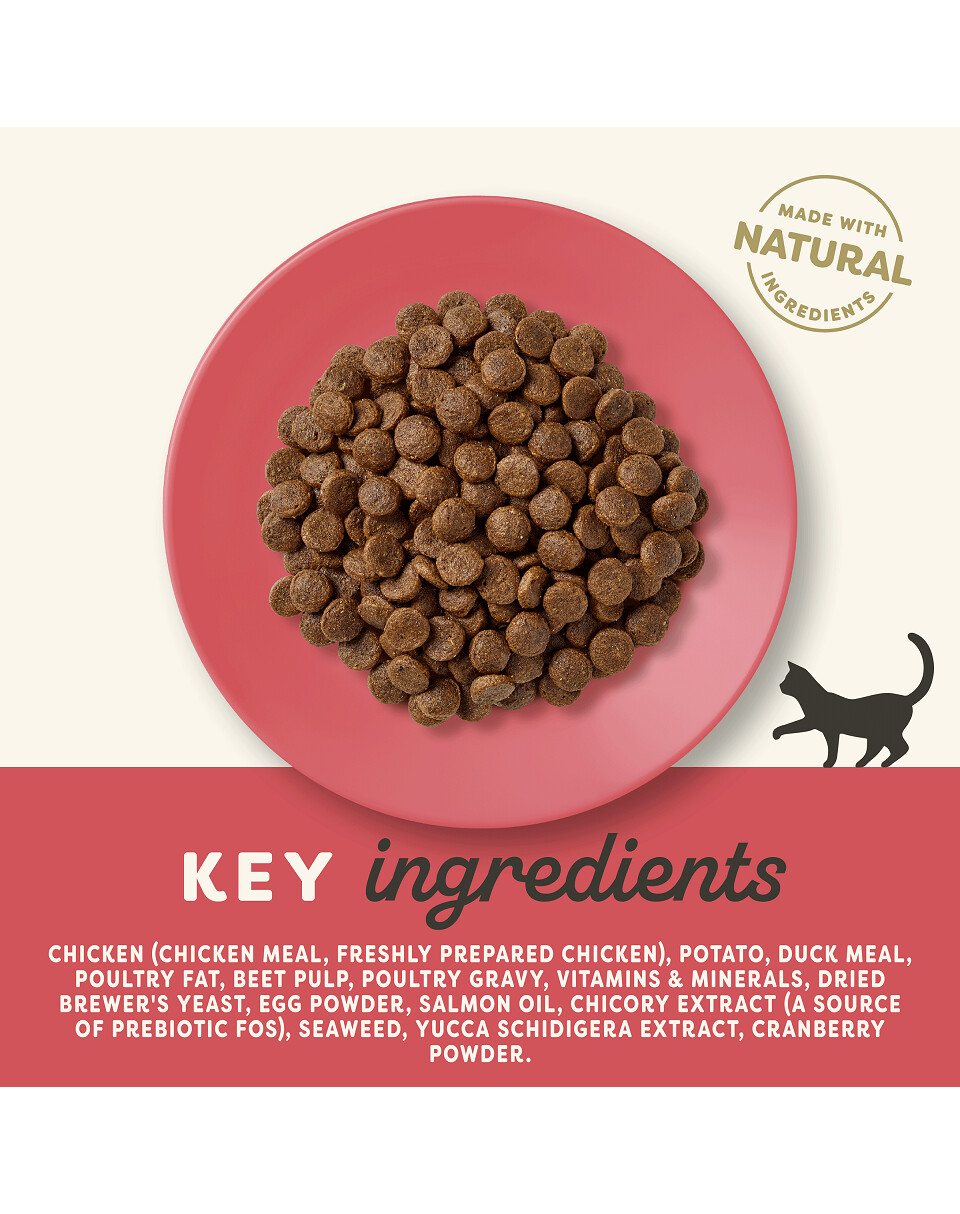 Kuracie mäso (47%), kačacie jedlo (21%), čerstvo zomleté kuracie mäso (16%), zemiaky, repa, droždie, kuracie omáčka (1%), lososový olej, vitamíny a minerály, sušené vajcia celulózové vlákno rastlinného pôvodu (0,03%), chlorid sodný, uhličitan vápenatý, morské riasy, brusnice, dl-metionín, chlorid draselný, výťažok z yucky, výťažok z citrusových plodov, výťažok z rozmarínu
