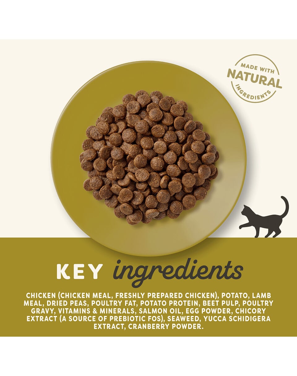 Obsahuje prvotriedne kuracie a jahňacie mäso, prírodné extrakty a probiotiká. Je prírodne konzervované s vitamínom E a rozmarínovým olejom. Obsahuje prírodný zdroj taurínu.