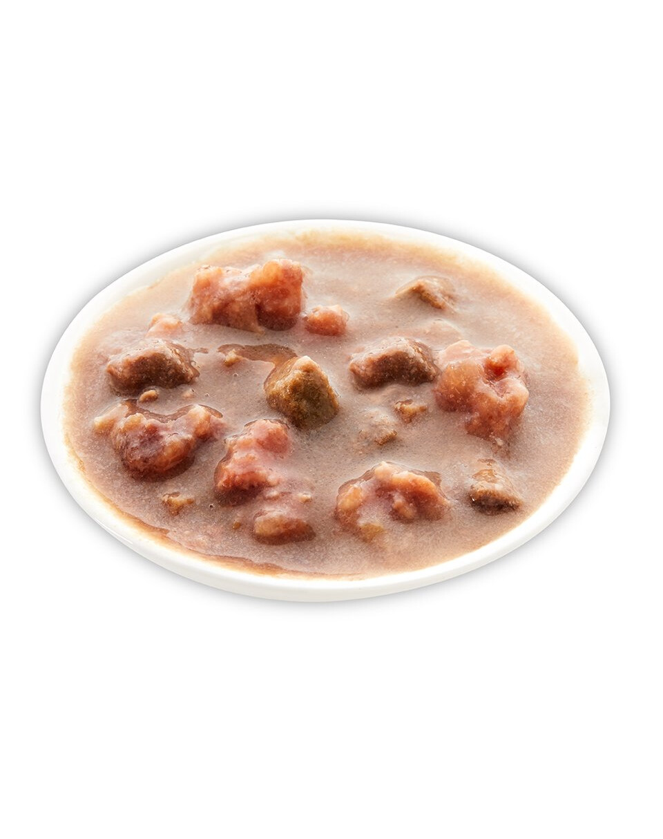 Hovädzie mäso 40 %, hovädzí vývar, hovädzia pečeň 5 %, paradajky 5 %, rastlinné želírovacie činidlo