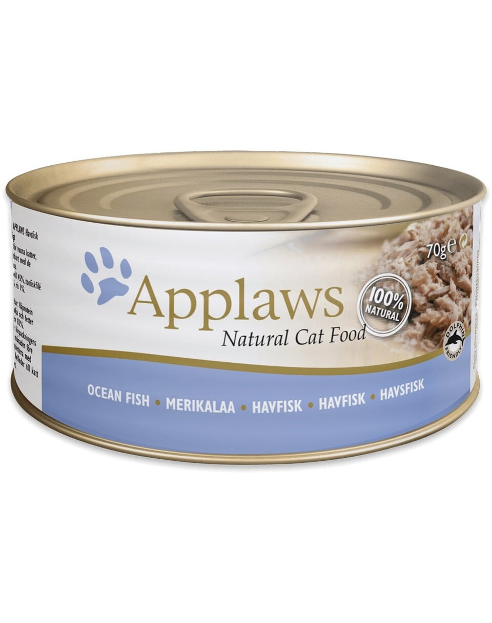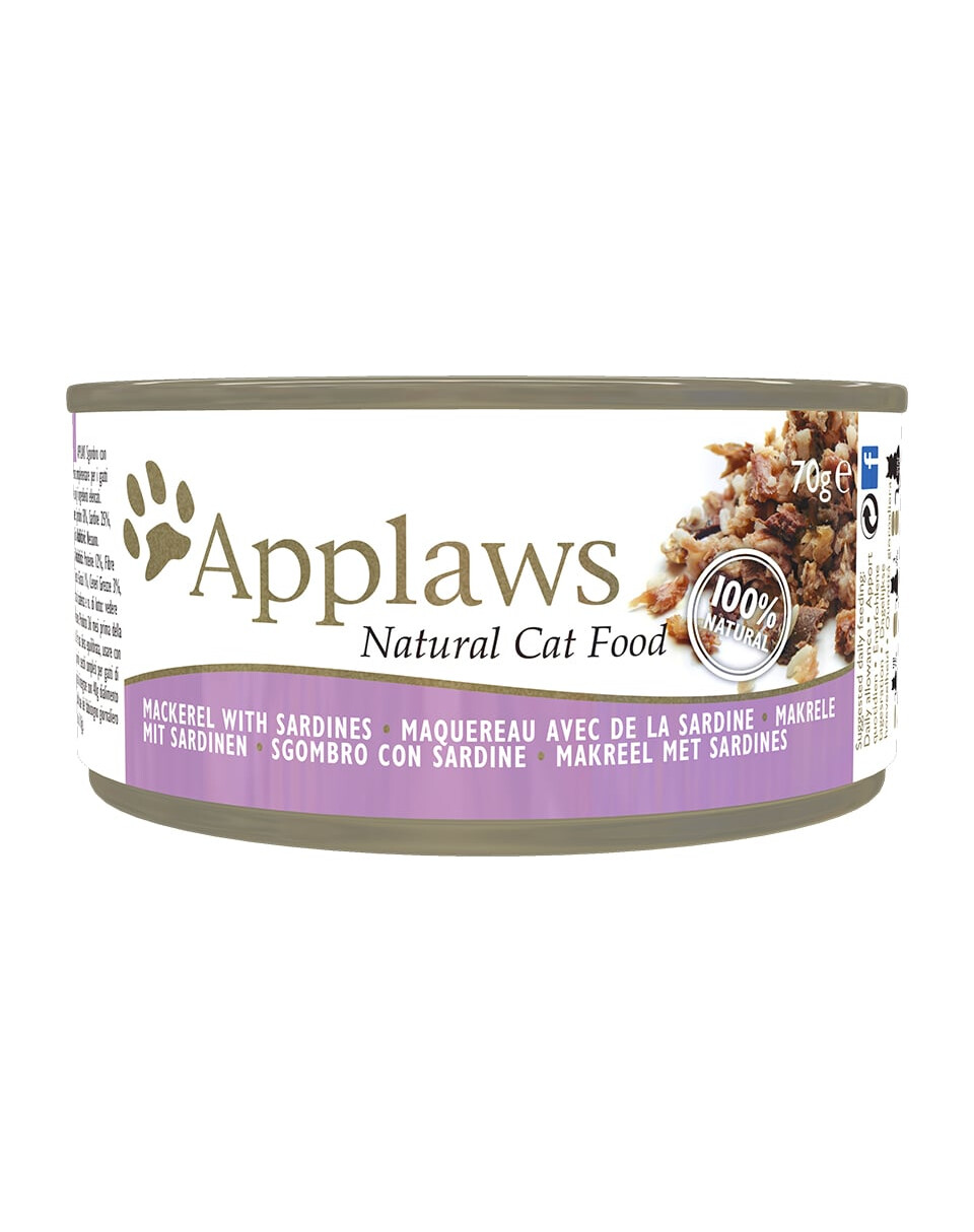 Makrela 70%, sardinka 5%, rybí vývar 24%, ryža 1%. Bez prídavných látok