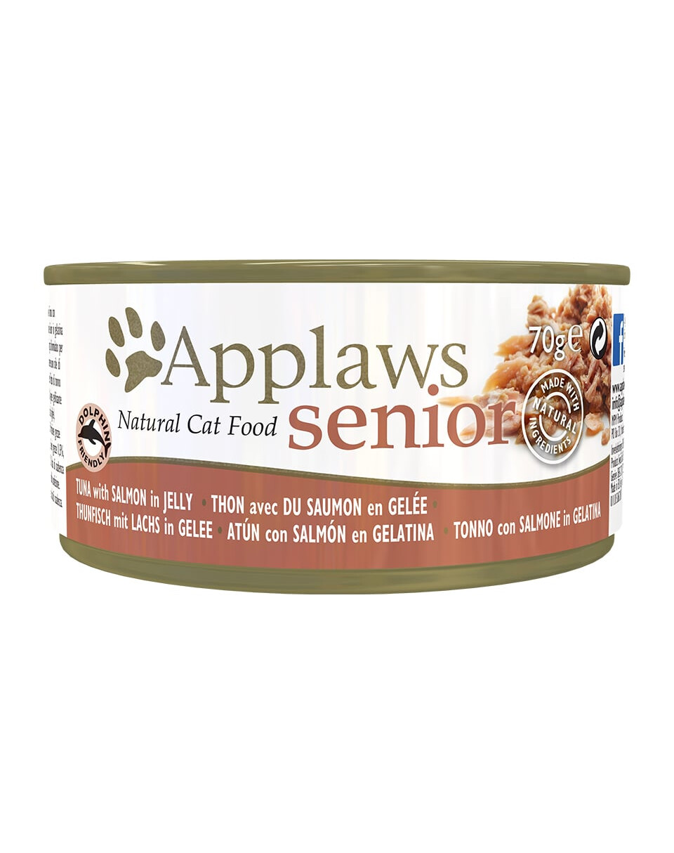 Filé z tuniaka 70%, rybí vývar 24%, krab 5%, ryža 1%. Bez prídavných látok