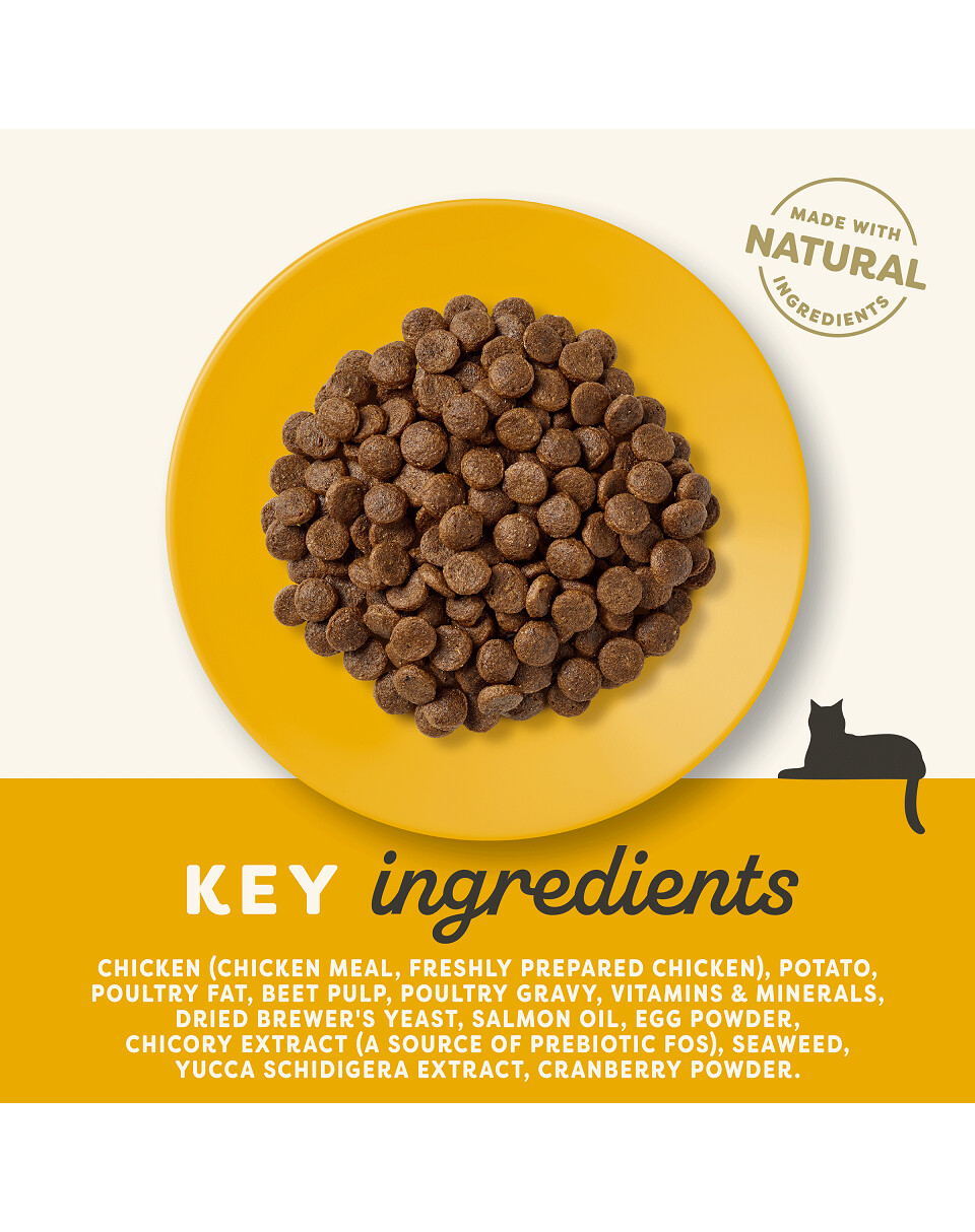 Kuracia múčka (67 %), čerstvo mleté hydinové mäso (12 %) (prírodný zdroj glukozamínu a chondroitínu), zemiaky, repná dužina, pivovarské kvasnice, hydinová omáčka (1 %), rastlinná celulózová vláknina (0,03 %), lososový olej, kokosový olej (prírodný zdroj triglyceridov mastných kyselín so stredne dlhým reťazcom), vitamíny a minerálne látky, sušené vajcia, chlorid sodný, uhličitan vápenatý, morské riasy, brusnice, dl-metionín, chlorid draselný, extrakt z juky, extrakt z citrusových plodov, extrakt z rozmarínu.