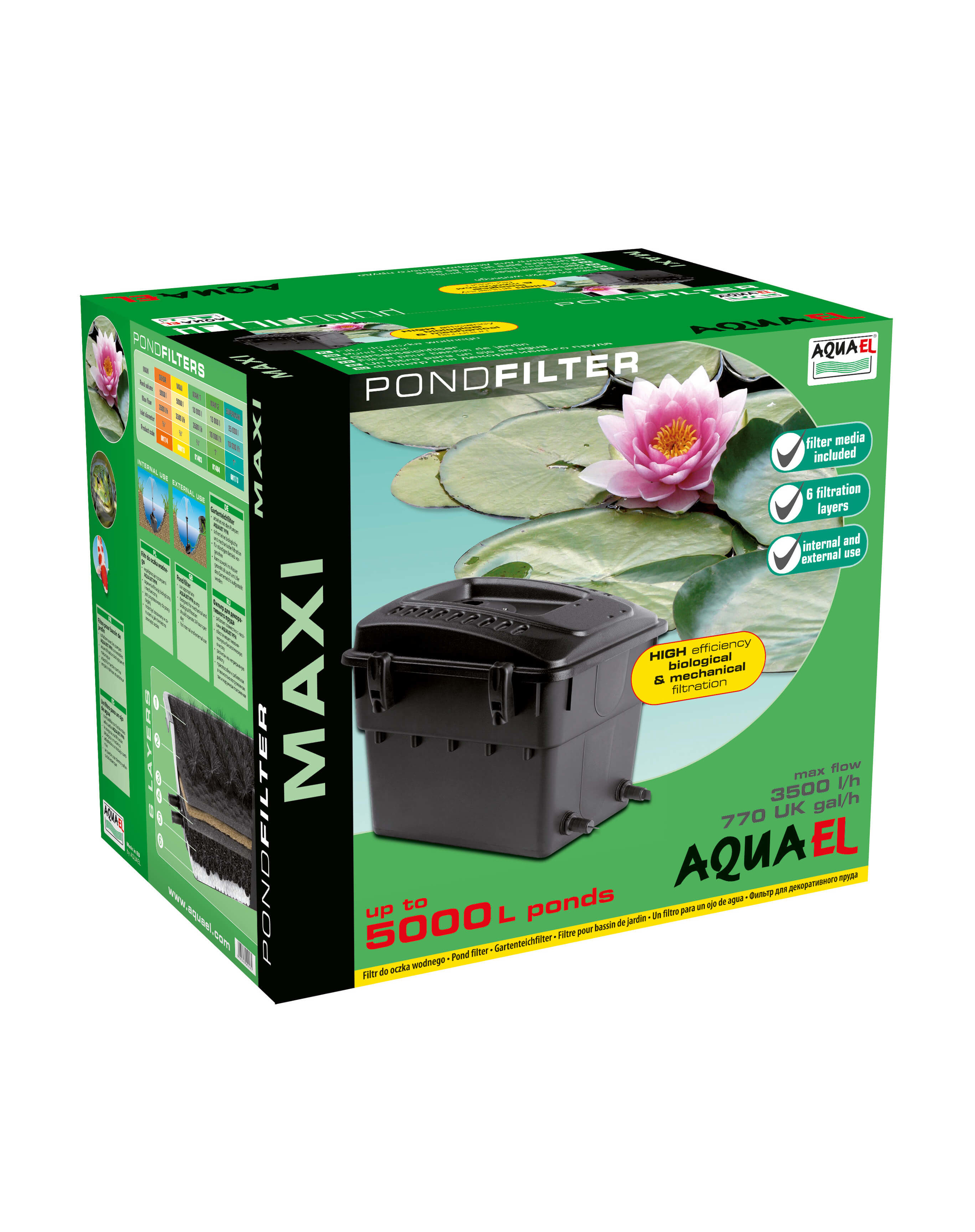 Jazierkový filter radu MAXI pre použitie v rybníkoch s kapacitou do 5000 litrov. V závislosti od spôsobu montáže sa môžu filtre na rybníky MAXI použiť ako externý filter alebo ponorný filter.