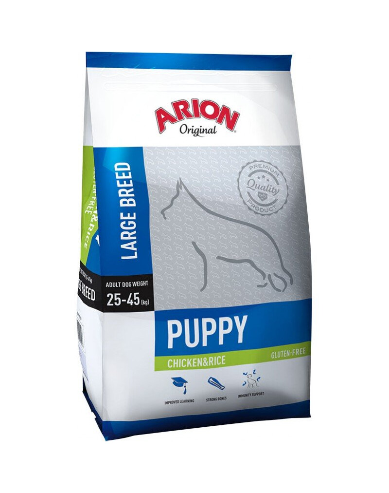 Arion Original Puppy dla szczeniąt dużych ras - Sucha karma dla szczeniąt od 3 do 15 miesiąca, przeznaczona dla ras dużych (waga dorosłego psa do 25-45kg). Podstawowe składniki karmy to łosoś i ryż. Karma nie zawiera glutenu, jakichkolwiek produktów z kukurydzy czy innych zbóż.