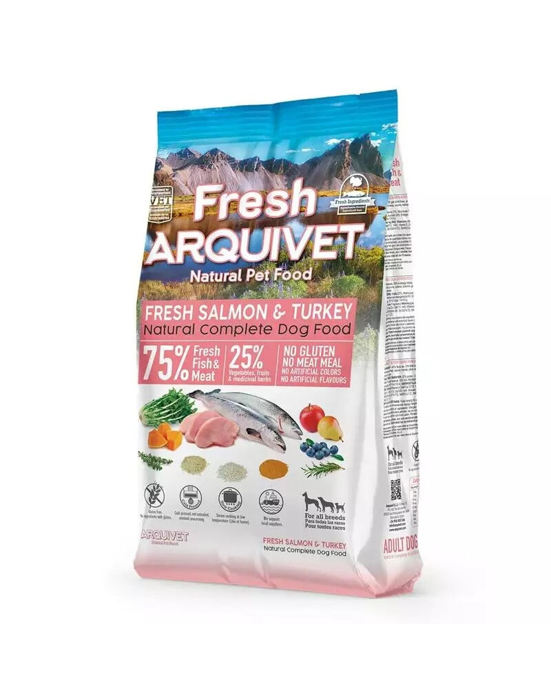Karma Arquivet, ktorá je polosladká a neobsahuje lepok, mäsovú múčku, umelé farbivá ani príchute. Okrem toho Arquivet fresh salmon poskytuje vášmu domácemu miláčikovi jedinečný zážitok z varenia vďaka znamenitej chuti morčacieho mäsa a lososa. Každé sústo poskytne vášmu domácemu miláčikovi explóziu skutočných, prírodných chutí. Toto krmivo je bohaté na živiny a chutné a spĺňa všetky potreby vášho psa.
