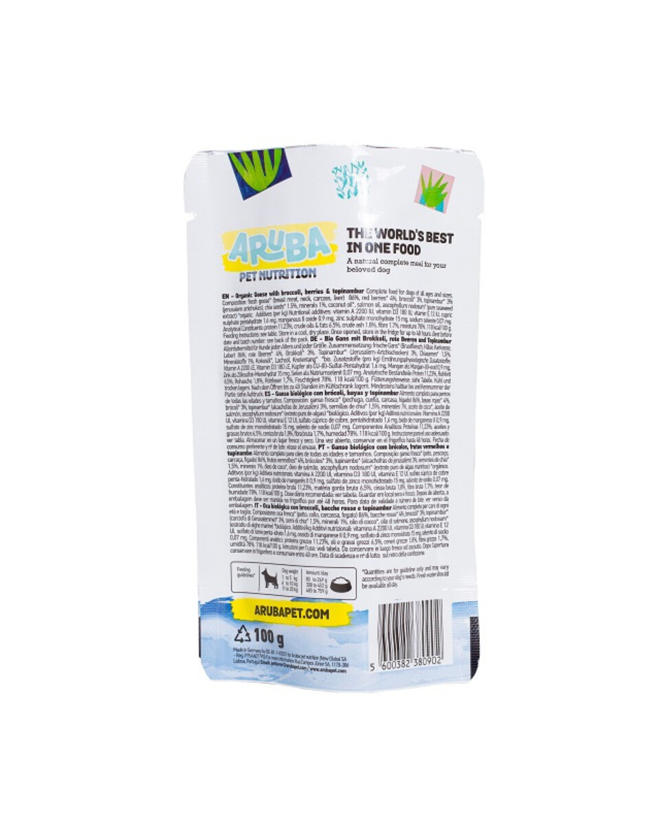Zloženie: čerstvé husacie mäso* (prsia, krk, jatočné telo, pečeň) 86 %, červené bobule* 4 %, brokolica* 3 %, topinambur* 3 % (topinambur), chia semienka* 1,5 %, minerálne látky 1 %, kokosový olej*, lososový olej, Ascophyllum nodosum* (čistý extrakt z morských rias) *organické.