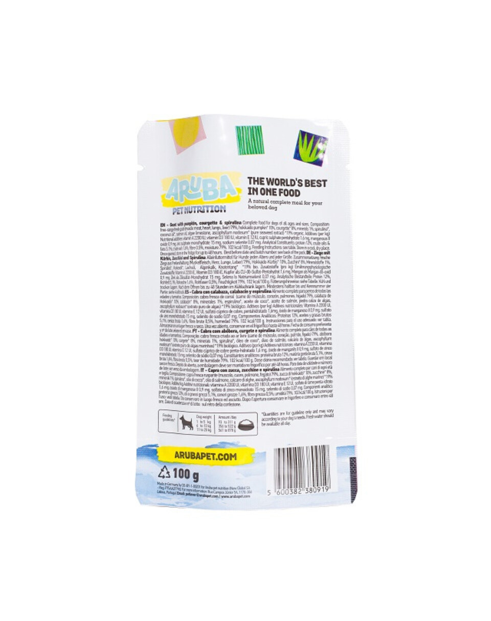 Zloženie: čerstvé voľne chované kozie mäso (svalovina, srdce, pľúca, pečeň) 79 %, tekvica hokkaido* 10 %, cuketa* 8 %, minerály 1 %, spirulina*, kokosový olej*, lososový olej, vápnik z morských rias, Ascophyllum nodosum* (čistý extrakt z morských rias) *19 % bio.