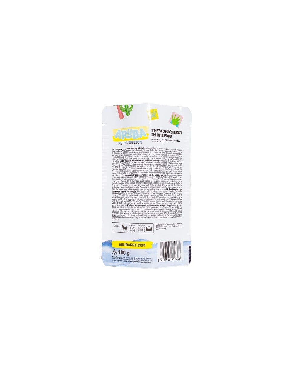 Zloženie: čerstvá treska 82 %, pohánková krupica* 10 %, kapusta* 5 %, lososový olej 1 %, minerálne látky 1 %, morské riasy, olivový olej*, rasca* *15,6 % bio.