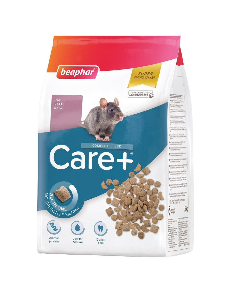 Care+ Rat je mimoriadne chutné, dokonale vyvážené, kompletné suché krmivo pre potkany. Receptúra bola vyvinutá v spolupráci s veterinármi, odborníkmi na výživu a chovateľmi potkanov. Špeciálny výrobný proces (extrúzia) zabezpečuje vysokú stráviteľnosť bielkovín, eliminuje z krmiva baktérie, plesne a vírusy, vďaka čomu je tento výrobok zdravým, bezpečným a výživným krmivom. Každá kŕmna granula má identické zloženie, čím sa úplne eliminuje fenomén selektívnej konzumácie len niektorých zložiek. Zvieratá zjedia takmer všetko krmivo a nenechávajú žiadne zvyšky a majitelia si môžu byť istí, že majú k dispozícii všetky potrebné látky. Potkany potrebujú bielkoviny zo živočíšnych aj rastlinných zdrojov. Bielkoviny v krmive majú vysoký obsah esenciálnych aminokyselín dôležitých pre správnu tvorbu svalov. Krmivo Care+ má nízky obsah tuku a vyvážený pomer mastných kyselín Omega 6 a Omega 3. Krmivo obsahuje prírodné zložky, ako sú echinacea, spirulina a Yucca schidigera, ako aj chelátové minerály. Kombinácia FOS a MOS má priaznivý vplyv na črevnú flóru.