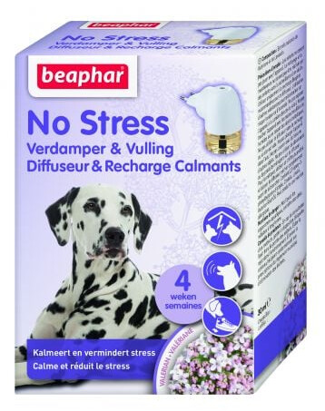 No Stress Calming Difuzér pre psov - behaviorálny aromaterapeutický prípravok je vyvinutý na báze valeriány a levandule. Pri použití v interiéri znižuje problémy so správaním vyplývajúce zo stresových situácií. Výrobok je vhodný pre psy všetkých plemien, veľkostí a veku. Je ideálny pre domáce zvieratá, ktoré sa dlhodobo zdržiavajú doma bez opatrovateľa, pri sťahovaní alebo pri zavádzaní nových ľudí a predmetov do domácnosti. Znižuje problémy spojené s nadmerným štekaním, hryzením predmetov alebo agresívnym správaním.