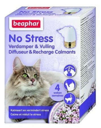 No Stress Calming Diffuser Cat - behaviorálny difuzér pre mačky na kontakt. Zloženie na báze valeriány a levandule. Používa sa v interiéri a znižuje problémy so správaním vyplývajúce zo stresových situácií. Výrobok je vhodný pre mačky všetkých plemien, veľkostí a veku. Ideálny pre domáce zvieratá, ktoré zostávajú doma dlhší čas bez opatrovateľa, pri sťahovaní alebo pri zavádzaní nových ľudí a predmetov do domácnosti. Znižuje problémy spojené s nadmerným mňaučením, škrabaním alebo nepríjemným značkovaním.