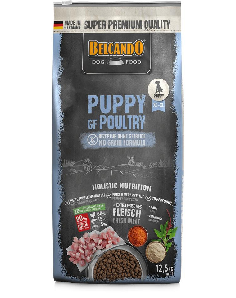 Zloženie: čerstvé hydinové mäso (40%); amarant (16%); hydinový proteín, nízky popol, sušený (14%); zemiakový škrob; hrachová múka; morský a prízemný zooplanktón (krill, 2,5%); rybia múčka z morských rýb (2,5%); želatína, hydrolyzovaná (2,5%); pivovarské kvasnice, sušené (2,5%); sušené vajce; rohovníkové struky, sušené; fosforečnan vápenatý; hydinový tuk; sušená repná dužina, bez cukru; Chia semená; hydrolyzovaná hydinová pečeň; lososový olej; chlorid sodný; chlorid draselný.
