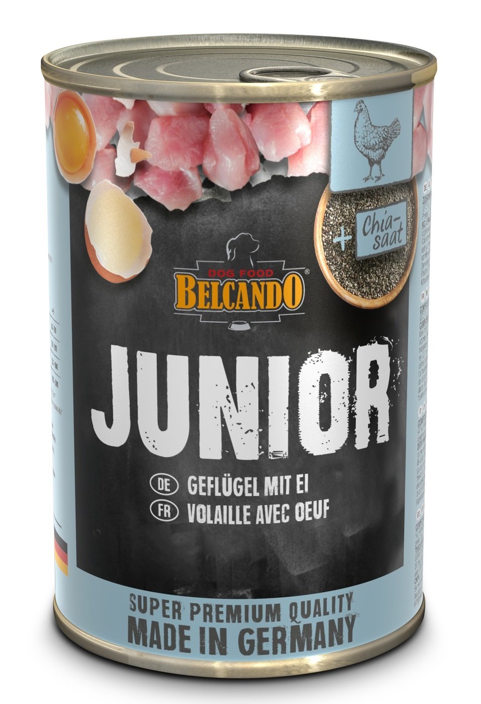 Wysoka zawartość mięsa w BELCANDO w puszkach ze względu na swoją smakowitość doskonale stymuluje apetyt psa również u psów wybrednych i niejadków. BELCANDO w puszkach jest idealnym uzupełnieniem dziennej porcji karmy suchej. Skład Mięso i produkty pochodzenia zwierzęcego (66% drób), rosół drobiowy (29%), jaja (4%), tłuszcze i oleje (0,5%), składniki mineralne. Analiza Proteiny (12%), tłuszcze (6,8%), popiół (2%), włókno (0,3%), wilgotność (77%), wapń (0,4%), fosfor (0,19%), witaminy, cynk, mangan, jod.