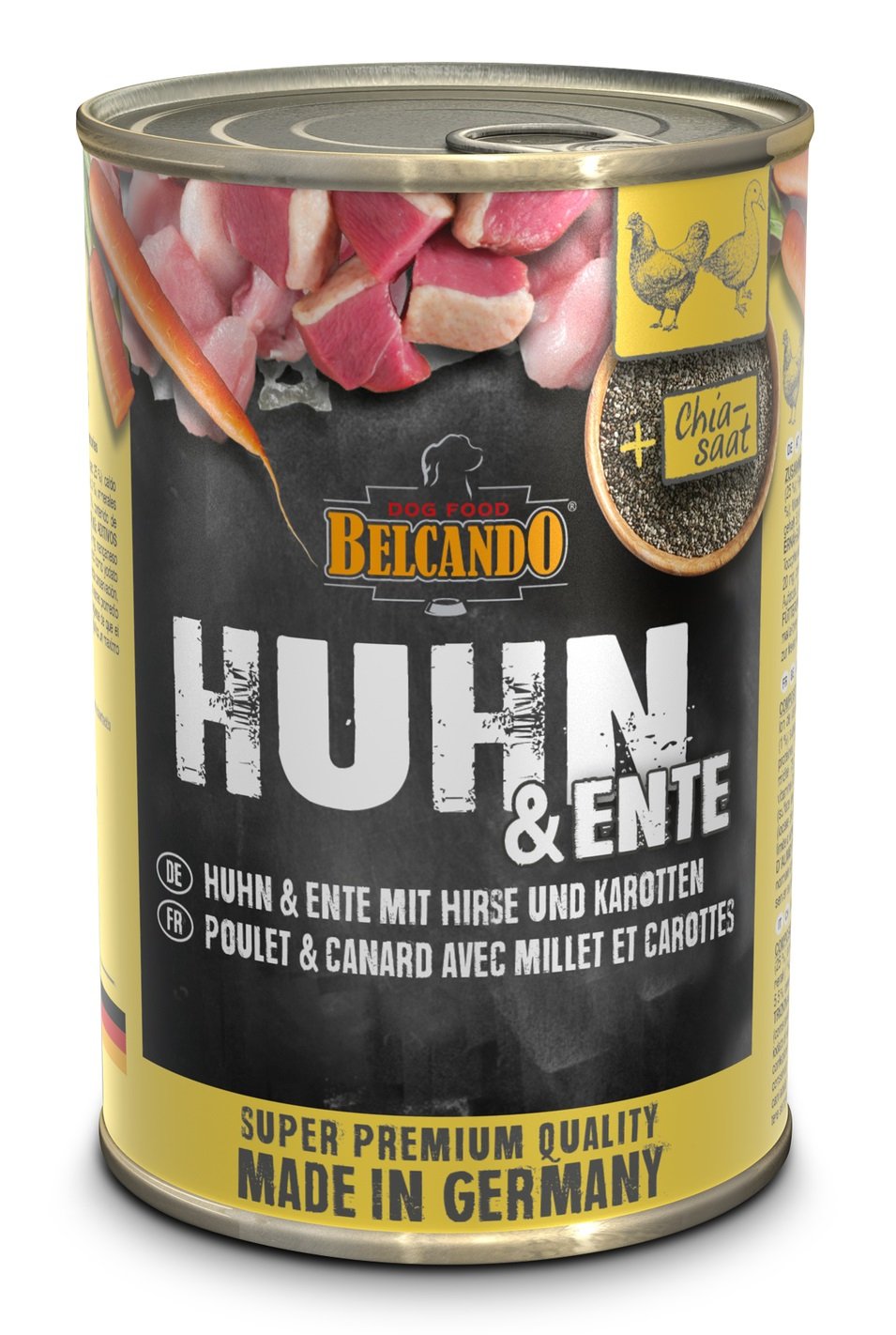 Mokré jedlo pre dospelých psov. Jedlo je založené na jemne varených kúskoch kuracieho a kačacieho mäsa s prídavkom prosa a mrkvy. Obsahuje prídavok svetlicového oleja, ktorý je vynikajúcim zdrojom polynenasýtených kyselín. Určené pre dospelých psov všetkých plemien. Obsahuje iba prírodné zložky. Bez konzervantov a farbív.