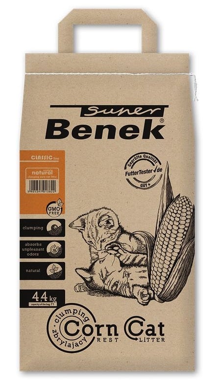 Super Benek Corn Cat čerstvá tráva je inovatívne stelivo pre mačky, ktoré je 100% prírodné, vyrobené z rastlinného materiálu. Neboli pridané žiadne chemické látky, preto je toto stelivo kompostovateľné a biologicky rozložiteľné a môžete ho ľahko zlikvidovať v kanalizácii domácej toalety. Stelivo je enormne savé, preto je kvapalina rýchlo vstrebávaná a tvorí kompaktné, ploché hrudky. To umožňuje ľahké a komfortné čistenie mačacieho záchodu. Stelivo sa zároveň vyznačuje obzvlášť efektívnou neutralizáciou zápachu, pachy sú rýchle absorbováné a perfektne zadržané. Príjemná vôňa čerstvej trávy zaisťuje príjemnú vnútornú klímu a rozvíja sa pri kontakte s kvapalinami. Vďaka prírodnej vône býva mačkami toto stelivo veľmi dobre prijímané. Vďaka jeho vlastnostiam sa stelivo menej roznáša mimo mačaciu toaletu.
