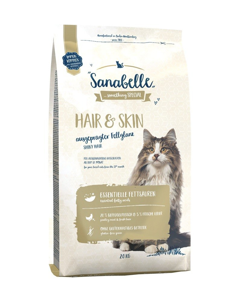 Sanabelle Hair & Skin je vyvážené suché krmivo pre dospelé mačky, ktoré slúži predovšetkým ku zlepšeniu srsti (shiny hair) a pokožky. Vysoký podiel cenných olejov a tukov dodáva esenciálne nenasýtené mastné kyseliny, hlavne omega 3 a 6 .