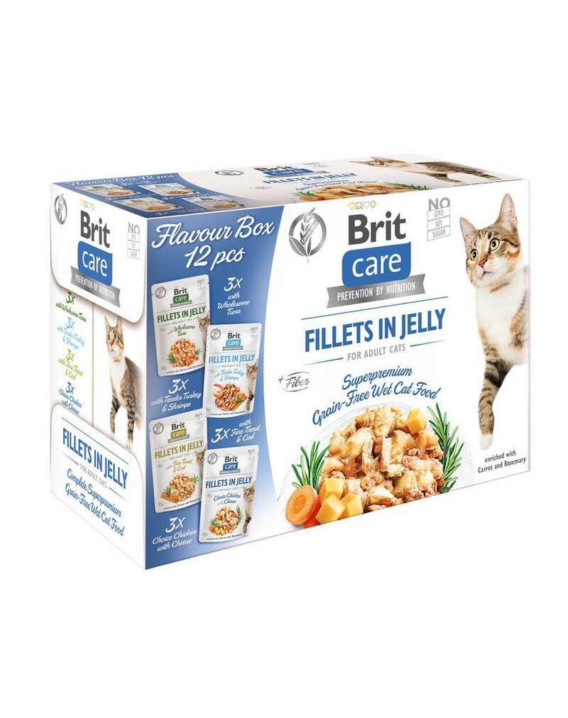 3 X Brit Care Cat Pouch Fillets in Jelly s jemným pstruhom a treskou obohatené o mrkvu a rozmarín