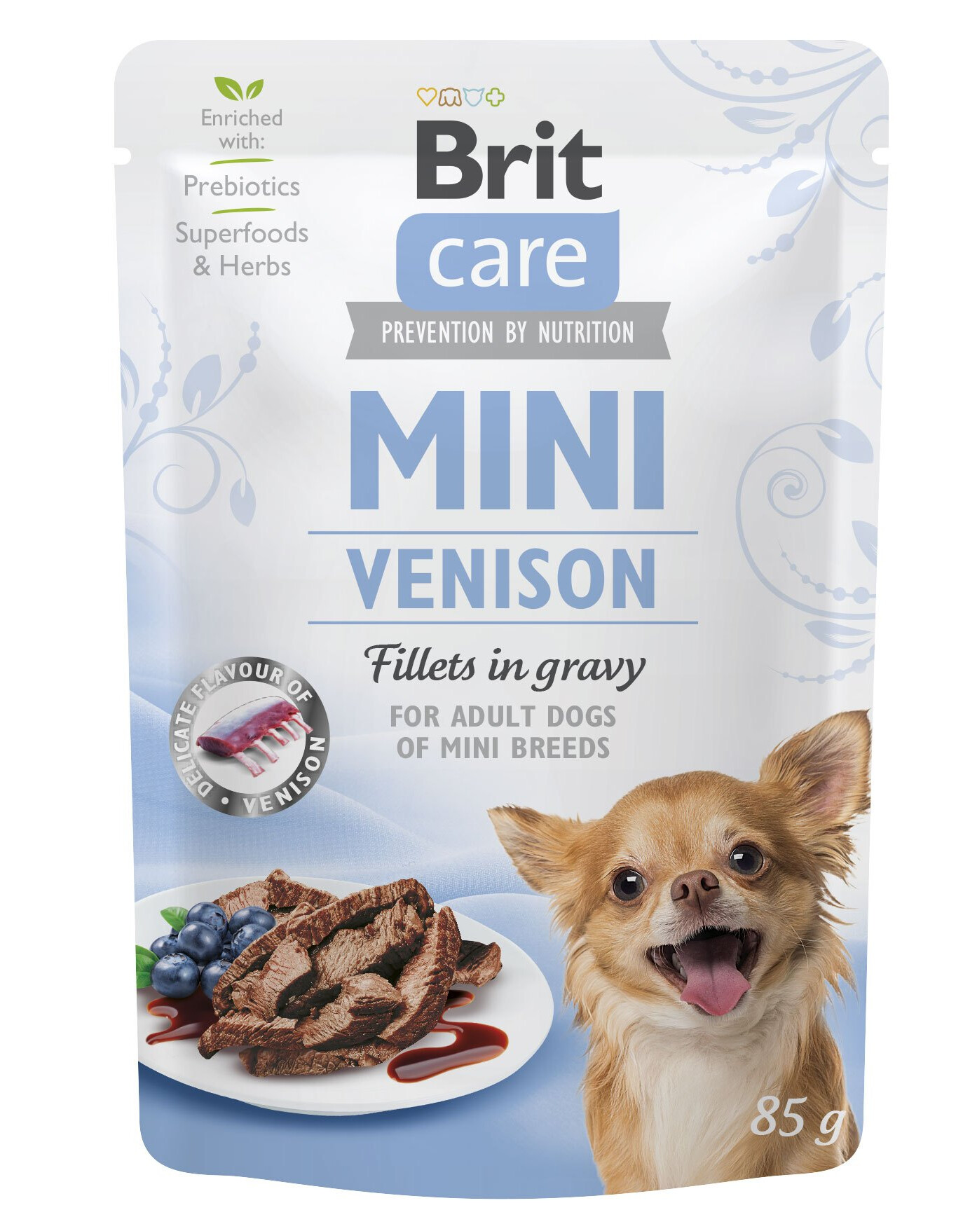 Mäso máčané v omáčke s bylinkami a ovocím. Zverina dodáva chuť a vitamíny skupiny B. Vysoký obsah vlhkosti má pozitívny vplyv na močové cesty psa a živočíšne bielkoviny sú dobre stráviteľné a posilňujú kondíciu celého organizmu.