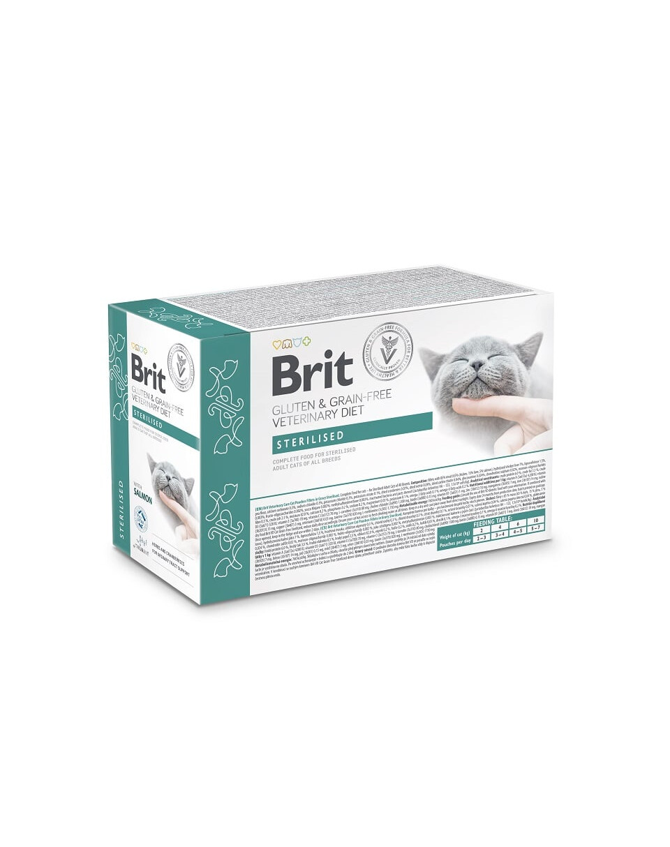 Brit Veterinary Care Cat Sterilised je kompletné, bezobilninové krmivo pre kastrované mačky, bez ohľadu na plemeno. Obsahuje až 85% filetov z mäsa – kurča, pečeň a losos – čo zabezpečuje vysokú chutnosť a ľahko stráviteľné bielkoviny podporujúce svaly. Formula obohatená o L-karnitín pomáha regulovať hmotnosť, zatiaľ čo citrát draslíka a prírodné byliny podporujú zdravie močového systému a udržiavanie správneho pH moču.