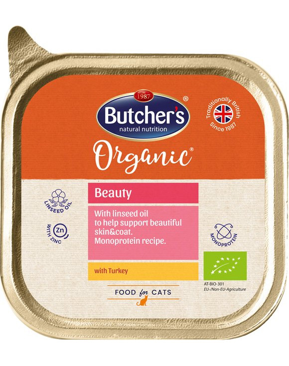 Butcher's Organic je kompletné jedlo pripravené z ekologických surovín, zodpovedne pestované v prírodnom prostredí bez antibiotík a herbicídov, ktoré zaručuje najvyššiu kvalitu. Tento recept dáva vášmu maznáčiku vyváženú a kvalitnú stravu. Okrem toho bola receptúra obohatená o organické funkčné zložky podporujúce špecifické potreby domáceho maznáčika.