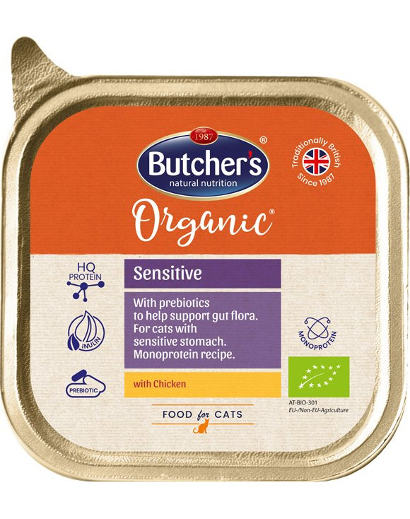 Butcher's Organic je kompletné jedlo pripravené z ekologických surovín, zodpovedne pestované v prírodnom prostredí bez antibiotík a herbicídov, ktoré zaručuje najvyššiu kvalitu. Tento recept dáva vášmu maznáčikovi vyváženú a kvalitnú stravu. Okrem toho bola receptúra obohatená o organické funkčné zložky podporujúce špecifické potreby domáceho maznáčika.