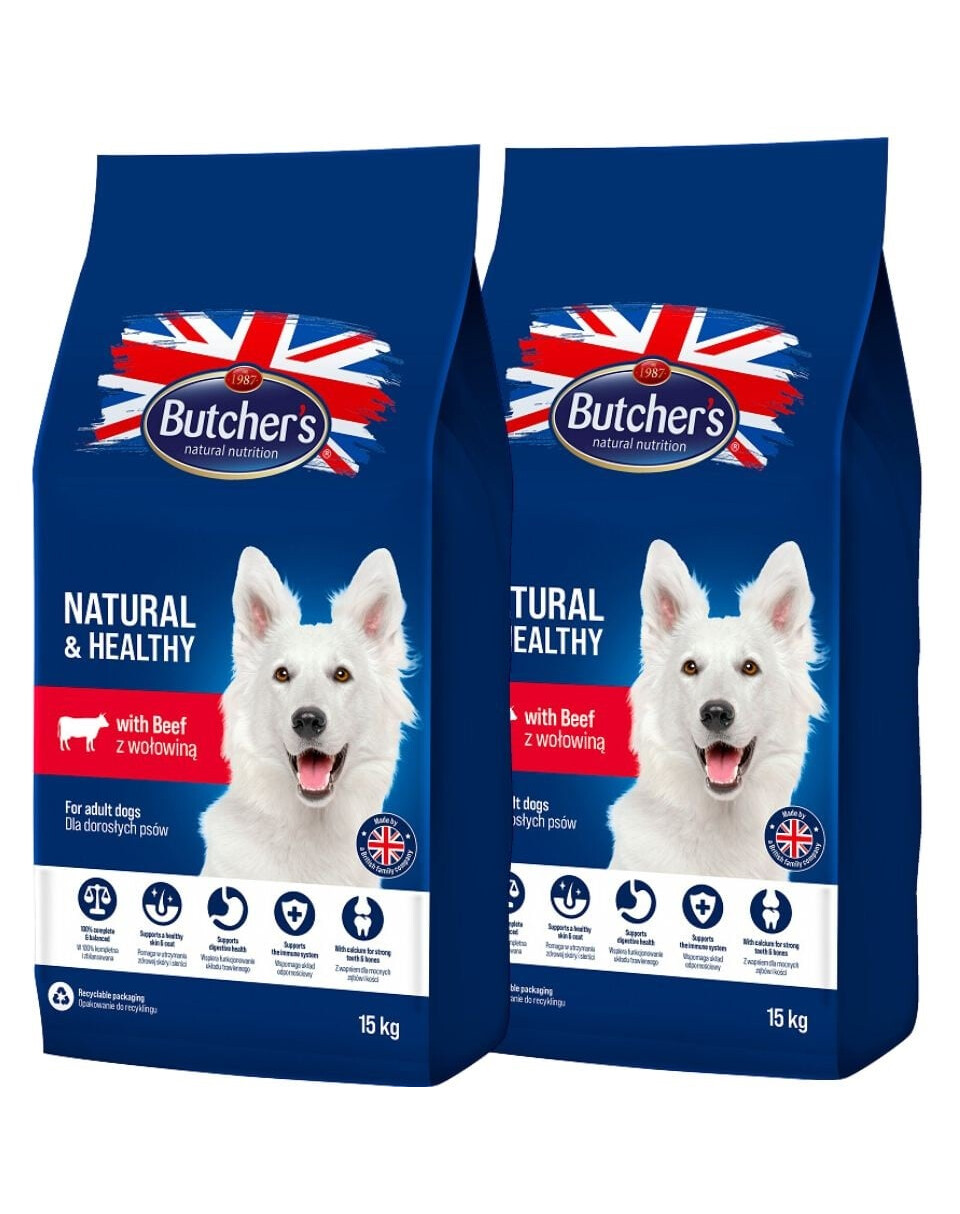 Zloženie: Obilniny, deriváty rastlinného pôvodu (vrátane čakanky 0,5 %, prírodný zdroj inulínu), mäso a mäsové deriváty (35 %, vrátane hovädzieho mäsa 8 %), minerály, zelenina, oleje a tuky (0,5 % lososový olej), droždie (0,01 %, 10 mg/kg mannán-oligosacharidov)