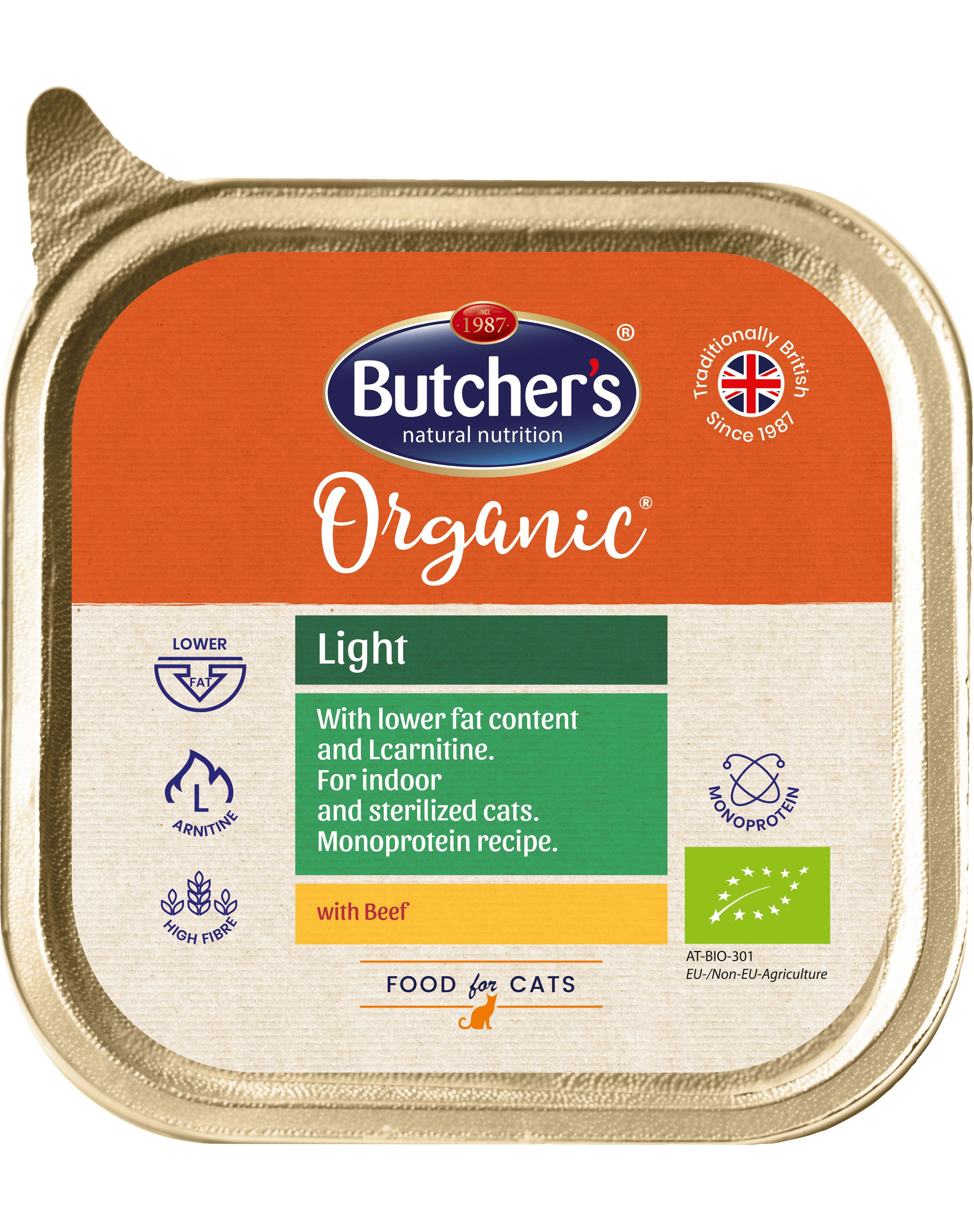 Butcher's Organic je kompletné jedlo pripravené z ekologických surovín, zodpovedne pestované v prírodnom prostredí bez antibiotík a herbicídov, ktoré zaručuje ich najvyššiu kvalitu. Tento recept dáva vášmu maznáčiku vyváženú a kvalitnú stravu. Okrem toho bola receptúra obohatená o organické funkčné zložky podporujúce špecifické potreby domáceho maznáčika. So zníženým obsahom tuku a L-karnitínu. Pre mačky žijúce v dome a sterilizované. Monoproteínová receptúra - ideálna pre alergie na potraviny.