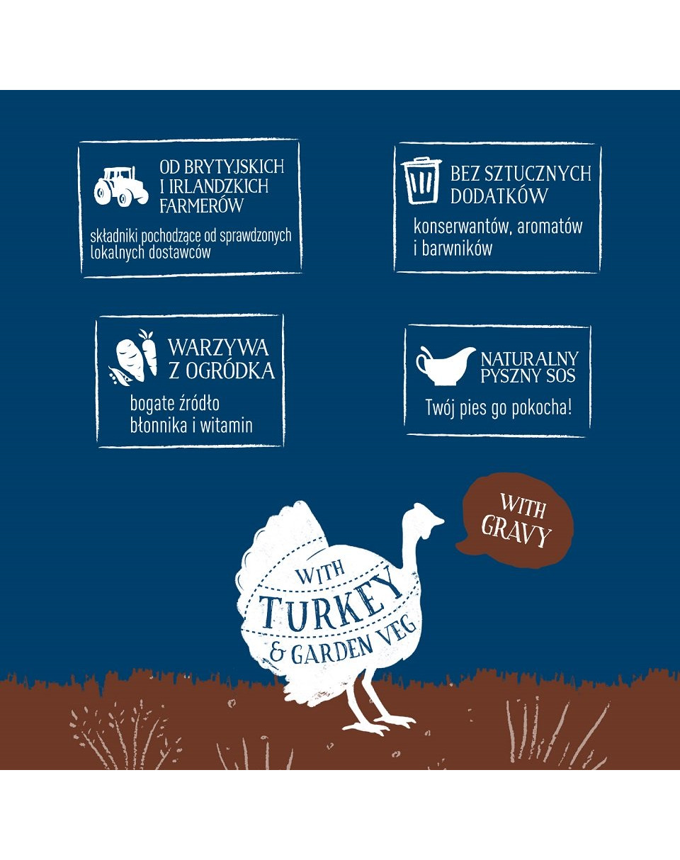 Kompletné krmivo pre psov podávané vo forme šťavnatých kúskov s morčacím mäsom v chutnej omáčke so zeleninou priamo zo záhradky. Dokonale vyvážená bezobilná receptúra na báze ingrediencií prírodného pôvodu vášmu miláčikovi určite zachutí a dodá mu všetky potrebné nutričné hodnoty