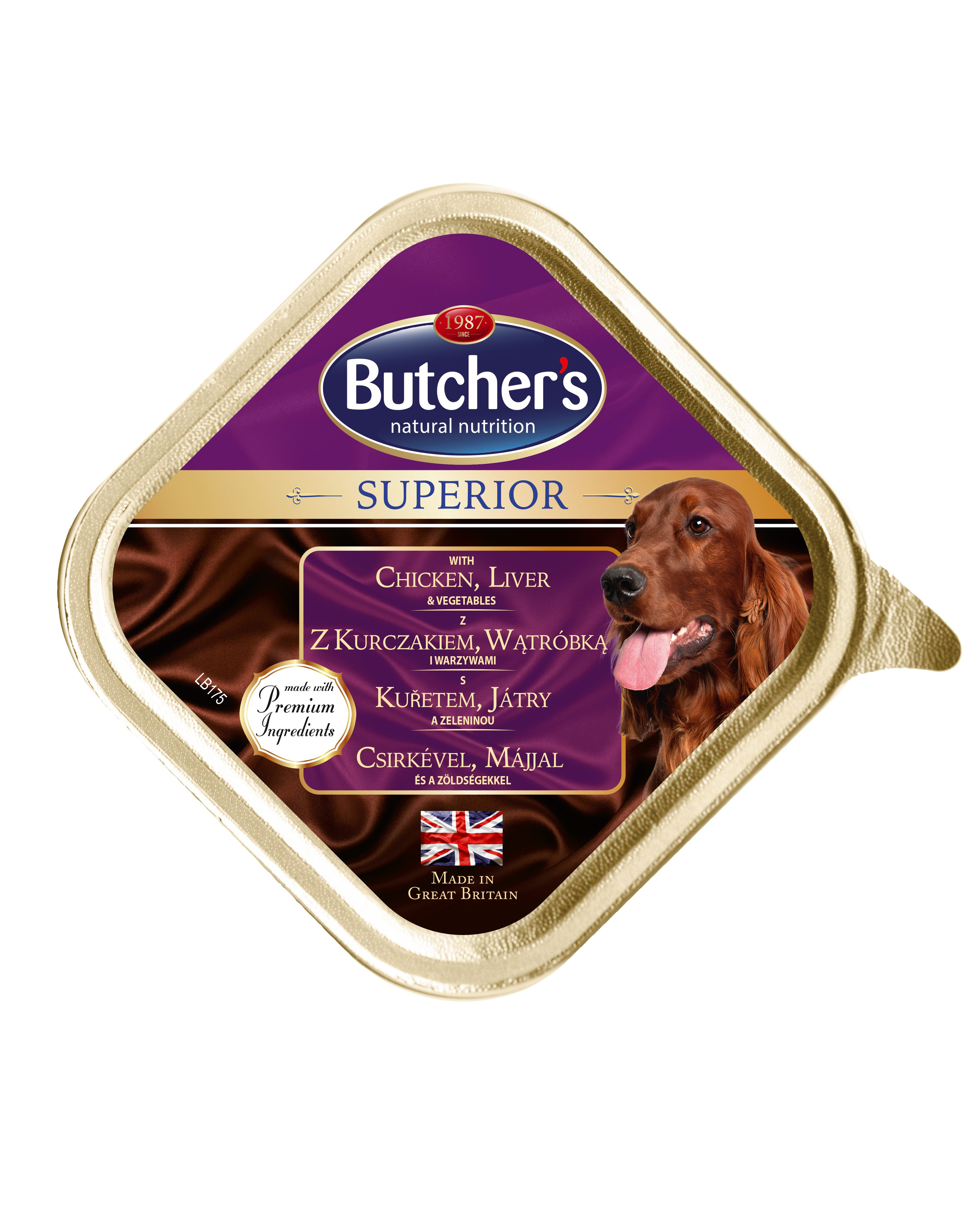 Butcher's Superior je jedinečné a kompletné jedlo pre psa pripravené z vybraného mäsa tej najvyššej kvality. Čerstvé mäso, jedinečné zloženie ingrediencií, to všetko vytvára rafinovanú chuť, ktorú váš pes môže mať každý deň. Vyberte si kvalitu a chuť, ktoré váš pes bude milovať!