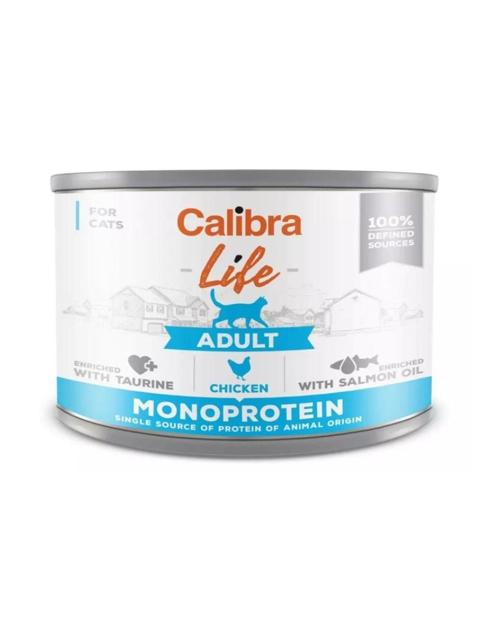 Calibra Cat Life Adult Chicken je kompletná konzerva s kuracím mäsom pre dospelé mačky založené na jednom druhu bielkovín.