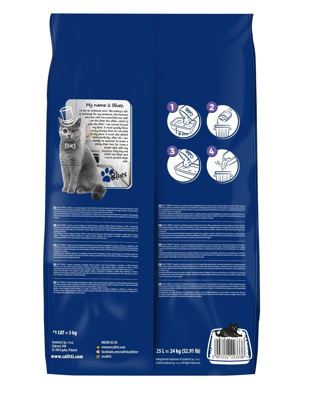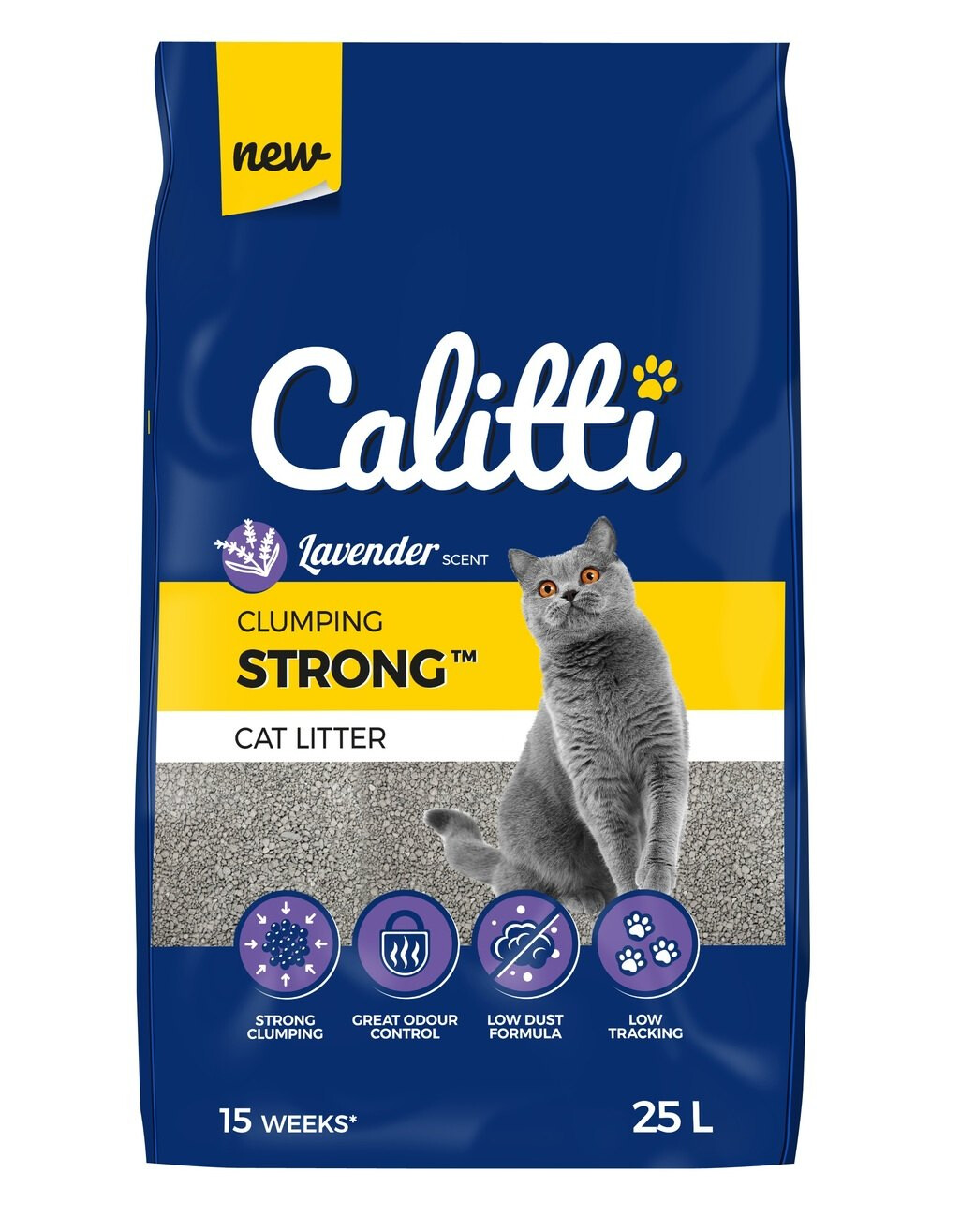 Calitti® STRONG ™ Lavender je veľmi zhlukujúce sa stelivo pre mačky s vôňou čerstvej levandule. Vyrobené zo 100% prírodného bentonitu, ktorý veľmi dobre absorbuje tekutiny, zabraňuje množeniu baktérií a tvorbe nepríjemného zápachu. Rýchlo sa zhlukuje do pevných a ľahko odstrániteľných hrudiek, takže je veľmi ľahké udržiavať ho čistý. Jemné zrná sú jemné k nohám mačky a nelepia sa na nich.