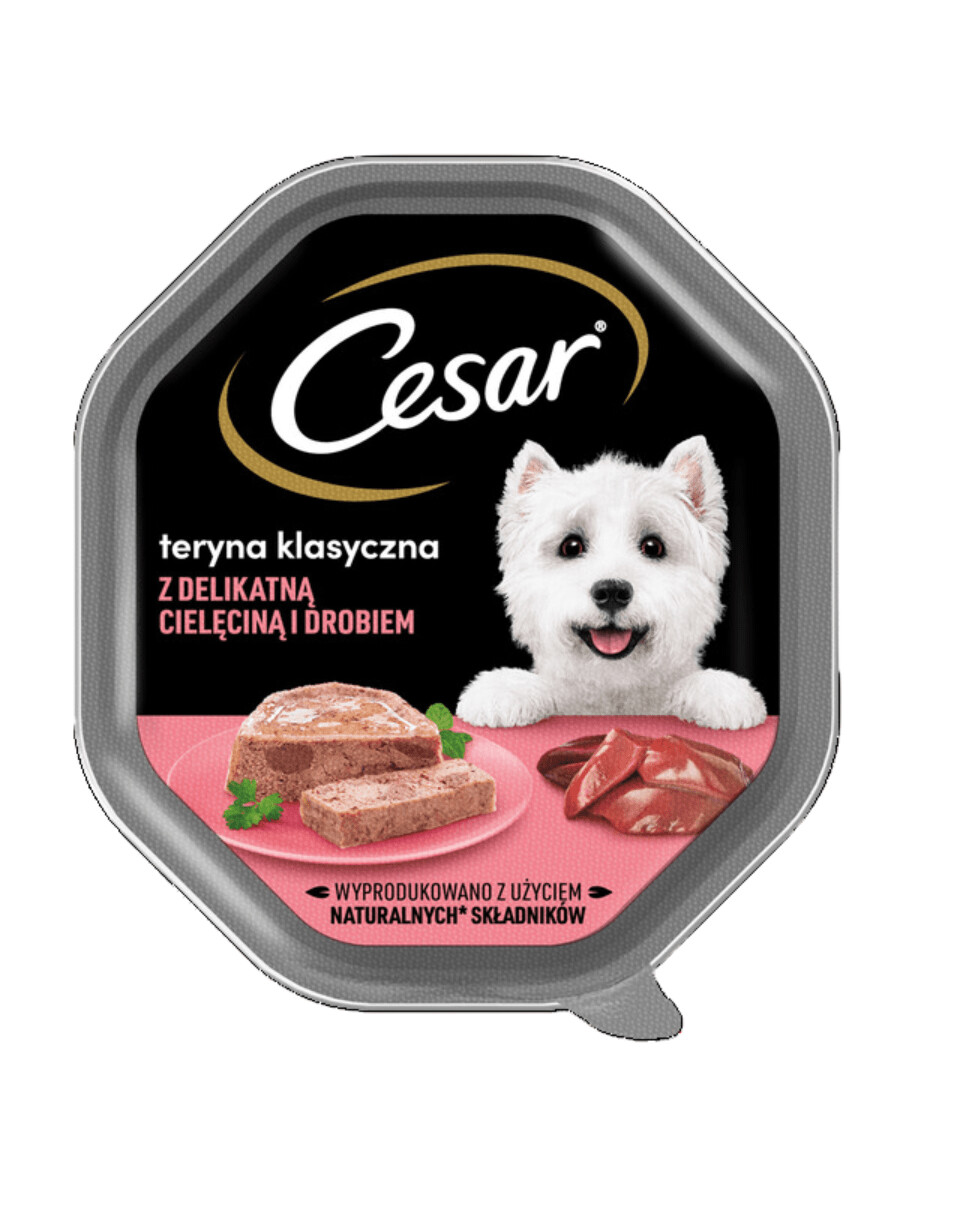 Chutné a zdravé krmivo Cesar s jemným teľacím a hydinovým mäsom je kompletné, vysoko kvalitné krmivo pre psov pripravené z prírodných surovín. Vynikajúca receptúra bola starostlivo vyvinutá za prispenia odborníkov na výživu a veterinárov z WALTHAM Institute of Animal Science. Toto lahodné krmivo pre psov je možné podávať v kombinácii so suchým krmivom alebo ako samostatné lahodné jedlo pripravené vo forme chutného tataráku. Doprajte svojmu psiemu kamarátovi to najlepšie tým, že mu budete dávať tácky Cesar®. Ich chuť a vôňa vášho maznáčika nadchne.