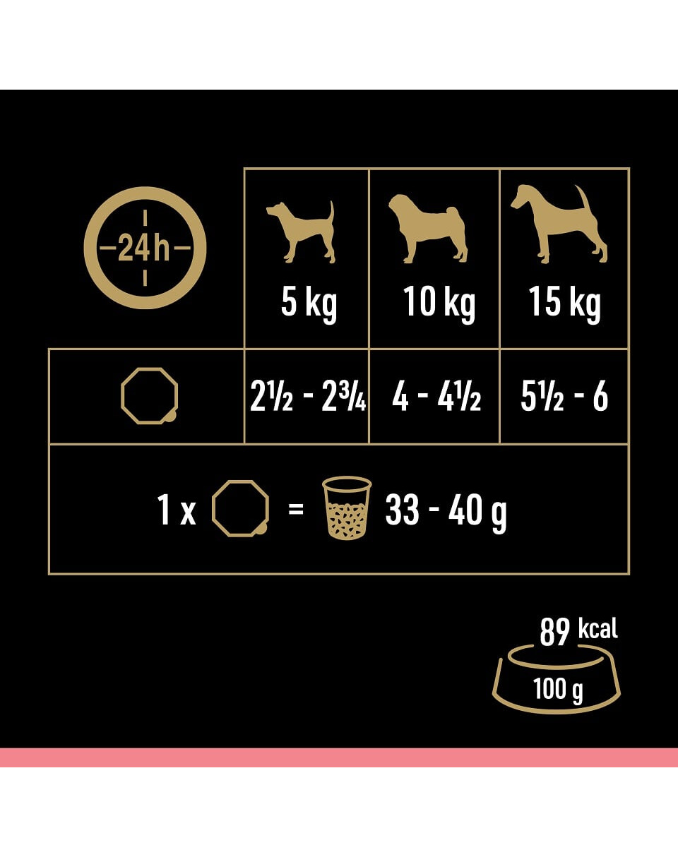Pes s hmotnosťou 5 kg potrebuje 2,5 - 2¾ vaničky denne, pes s hmotnosťou 10 kg potrebuje 4 - 4,5 vaničky denne, pes s hmotnosťou 15 kg potrebuje 5,5 - 6 vaničiek denne. Jednu vaničku je možné nahradiť 33 - 40 g suchého krmiva.