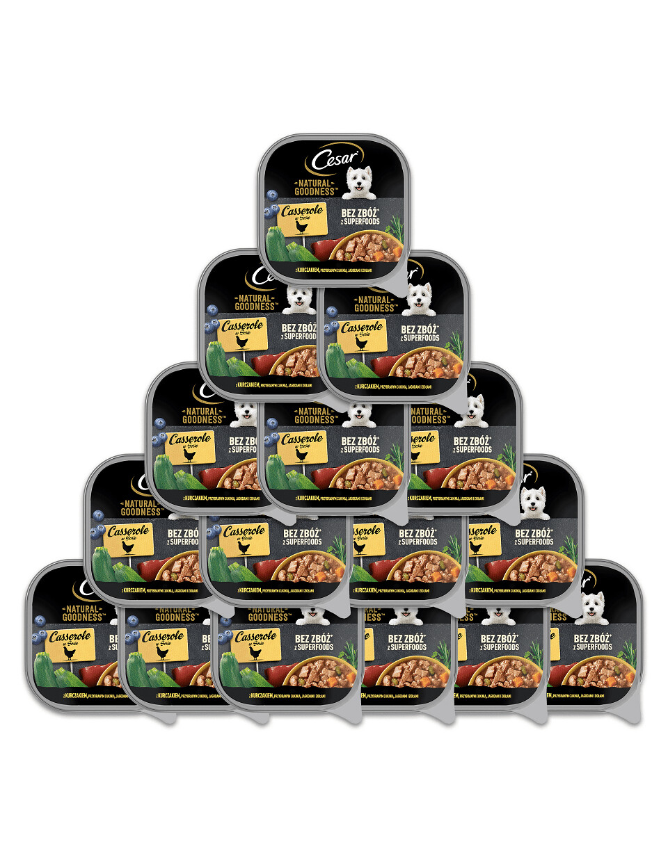 Krmivo Cesar Natural Goodness s kuracím mäsom bolo pripravené podľa starostlivo vybranej receptúry bez obilnín, ktorá psom poskytuje všetko, čo každý deň potrebujú. Toto jedlo je ideálne pre čerstvé a chutné každodenné jedlo. Toto krmivo môžete podávať so suchým krmivom alebo ako samostatný pokrm. Krmivo je ochutené kuracím mäsom, ozdobené cuketou, bobuľami a bylinkami - kuracie mäso je zdrojom bielkovín, cuketa je zdrojom vitamínov a minerálov. Krmivo pre psov Cesar Natural Goodness bolo pripravené tak, aby si zachovalo svoju prirodzenú výživovú hodnotu a lahodnú chuť. Na jeho vývoji sa podieľali odborníci na výživu a veterinári z WALTHAM Institute of Animal Science.