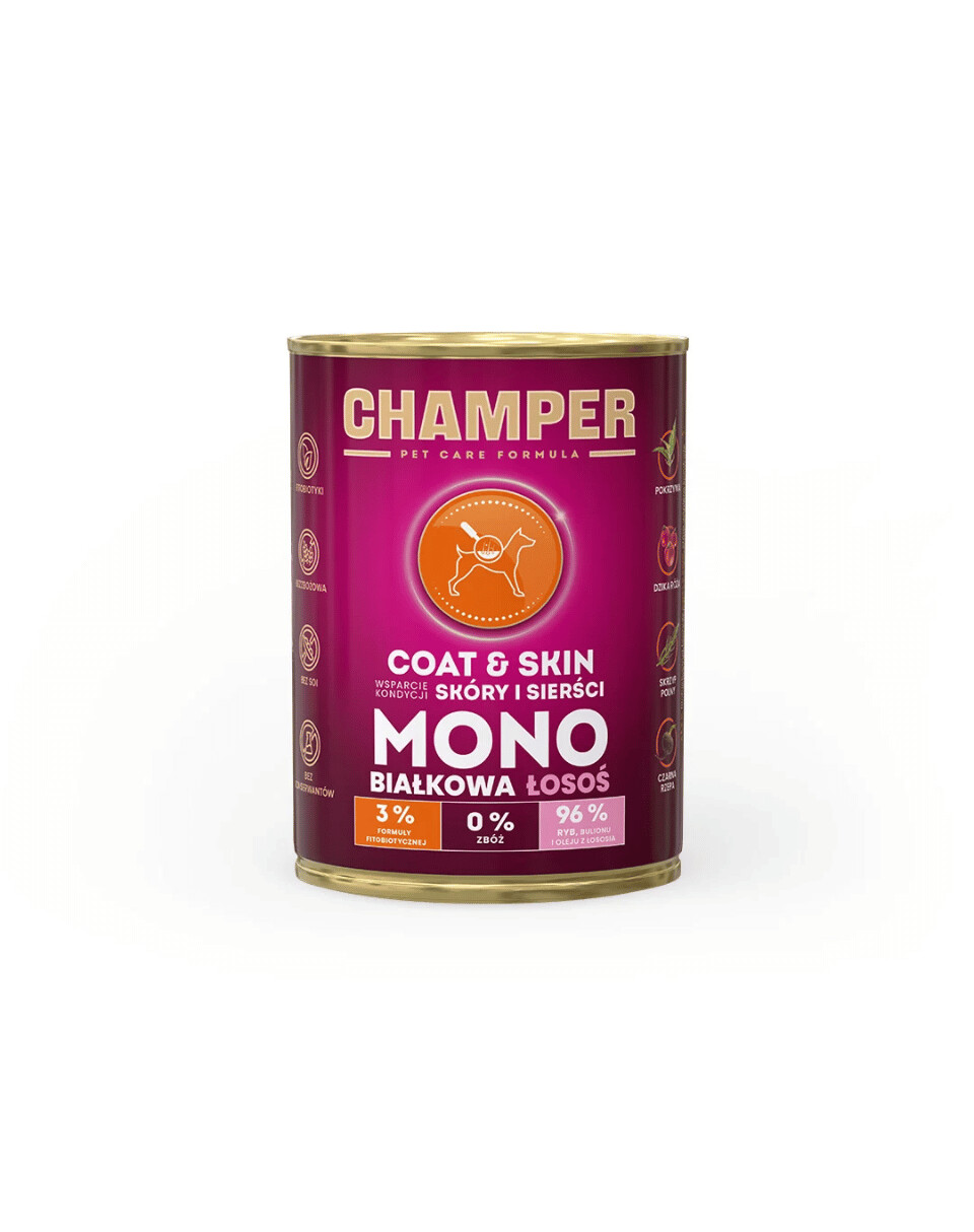 Vysokopodielové zloženie na báze lososa obsahuje až 96 % rýb, vývaru a lososového oleja – bohatého zdroja cenných omega-3 a omega-6 mastných kyselín, ktoré podporujú zdravé srdce, pokožku a lesklú srsť psa. Bez zbytočných plnidiel a umelých látok ,len čisté, výživné suroviny.